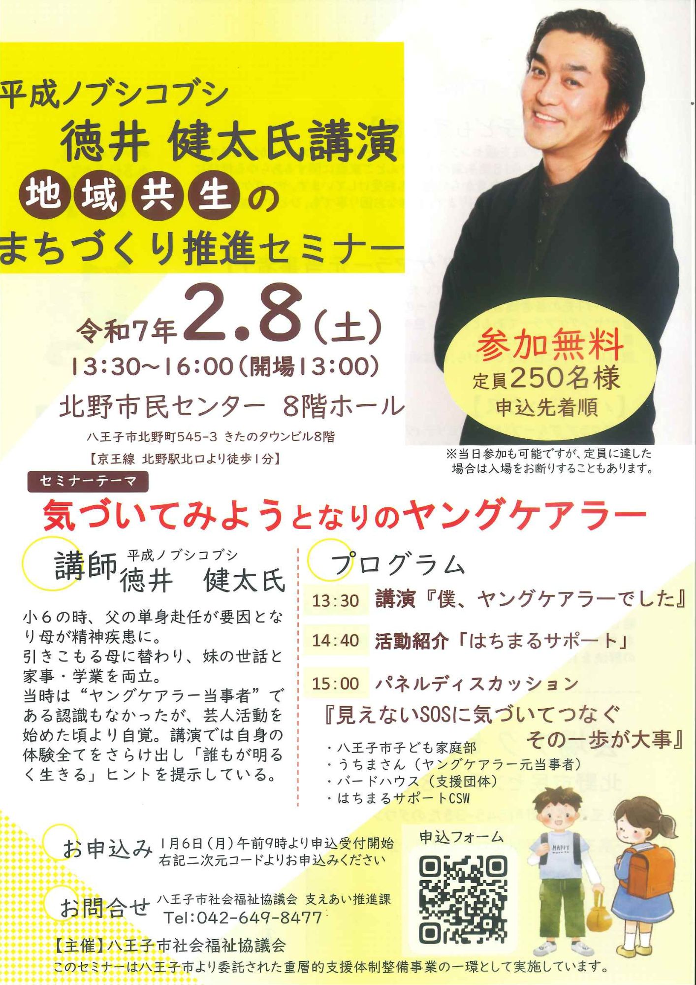 2/8 平成ノブシコブシの徳井健太さんの講演 2025/1/3 地域共生のまちづくり推進セミナーのお知らせです。明けましておめでとうございます。本年も情報発信に努めます。本年第一番のお知らせは「気づいてみよう となりの ヤングケアラー」をテーマにした講演会です。お知らせはこちら