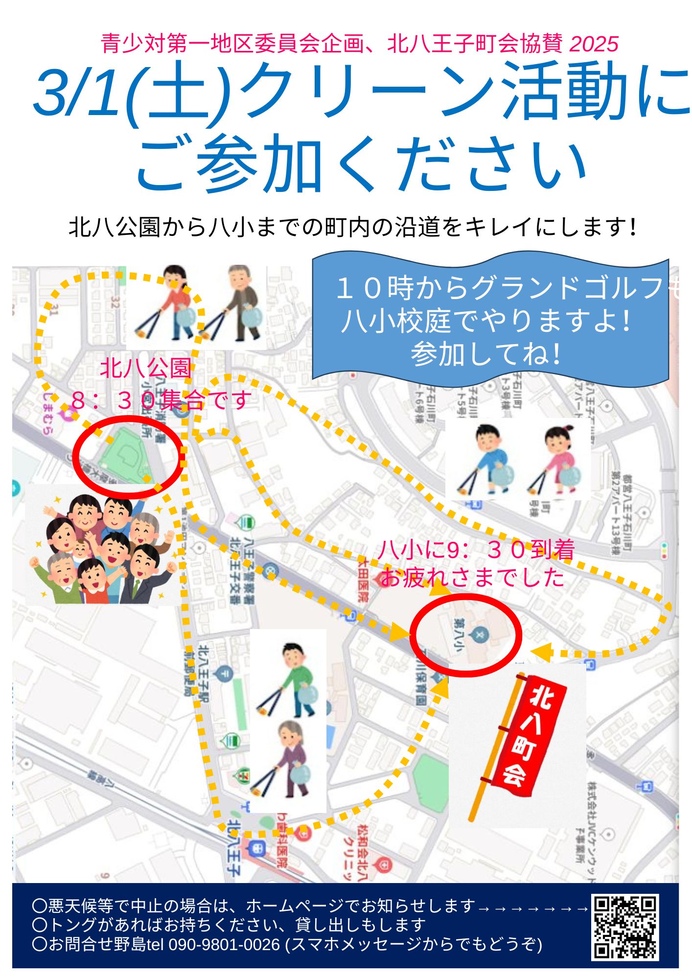 3/1(土)クリーン活動にご参加お願いします! 2025/2/1 朝8:30北八公園に集合ください!10時からグランドゴルフもあります。一中エリアで、各学校拠点に町を奇麗にします。青少対主催のクリーン活動に町会も参加します。チラシはこちら