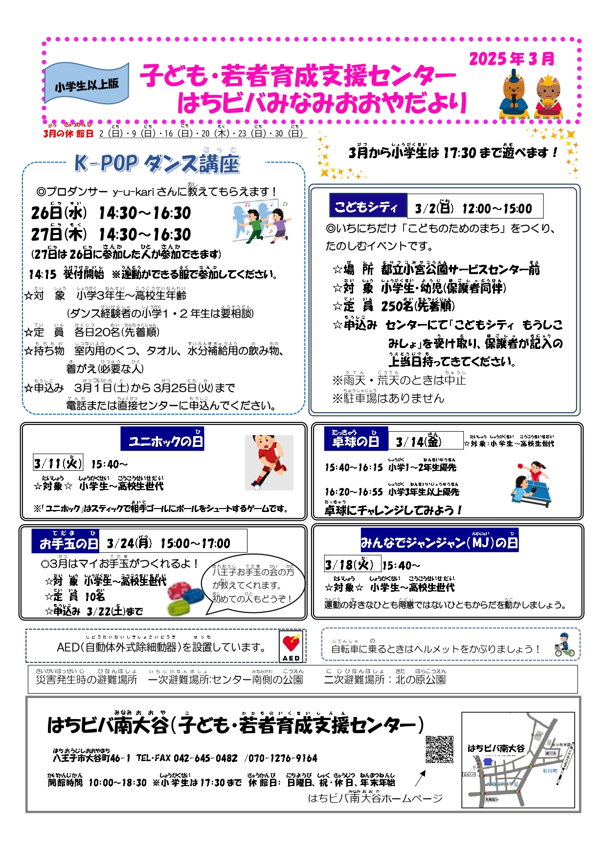 子ども・若者育成支援センターだより3月号 2025/2/25 児童館の名称は、「子ども・若者育成支援センター」通称「はちビバ」に変わりました!児童館は0歳から18歳まで無料で利用できる施設です。K-POPダンス講座もやってます。お知らせはこちら 1