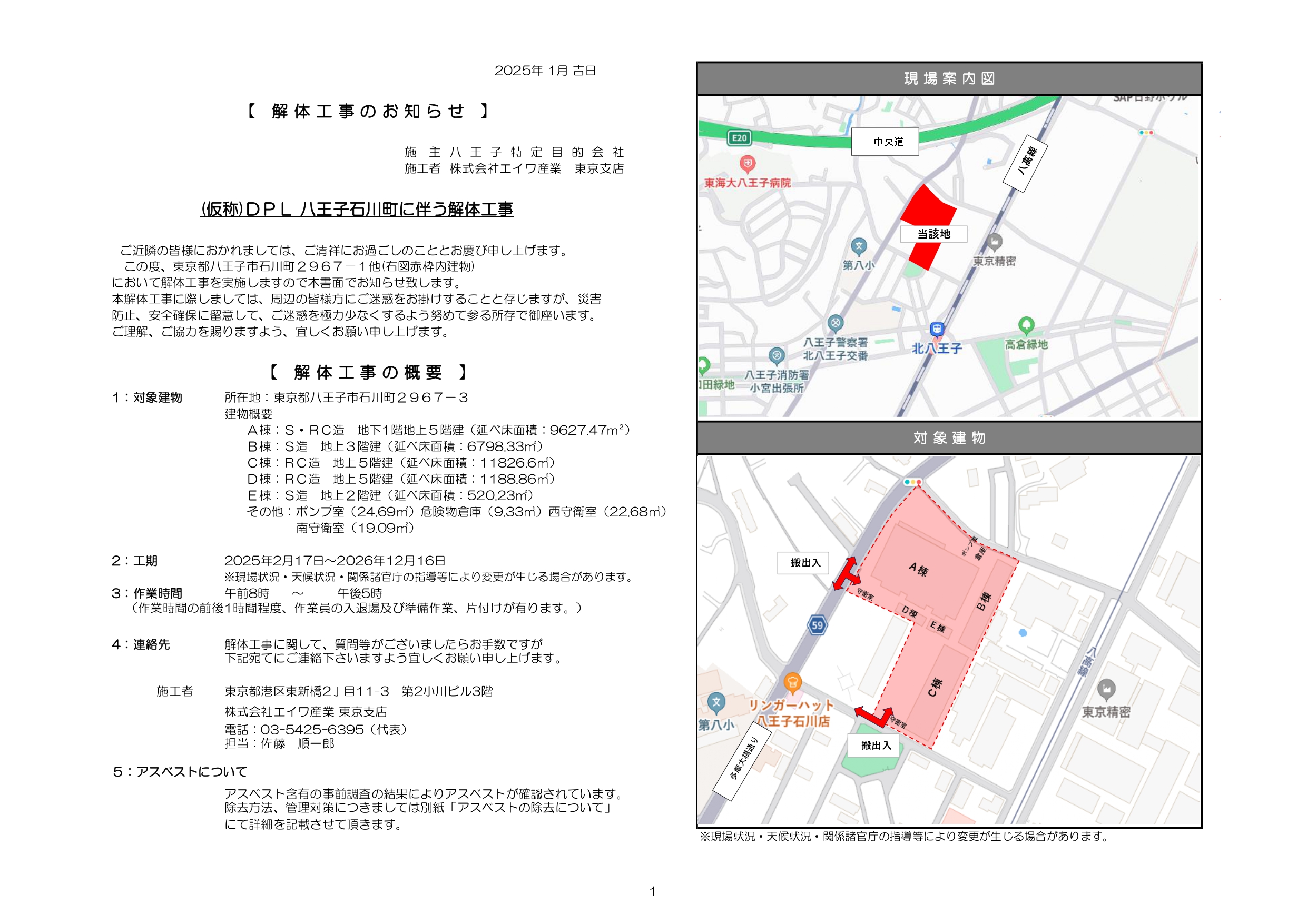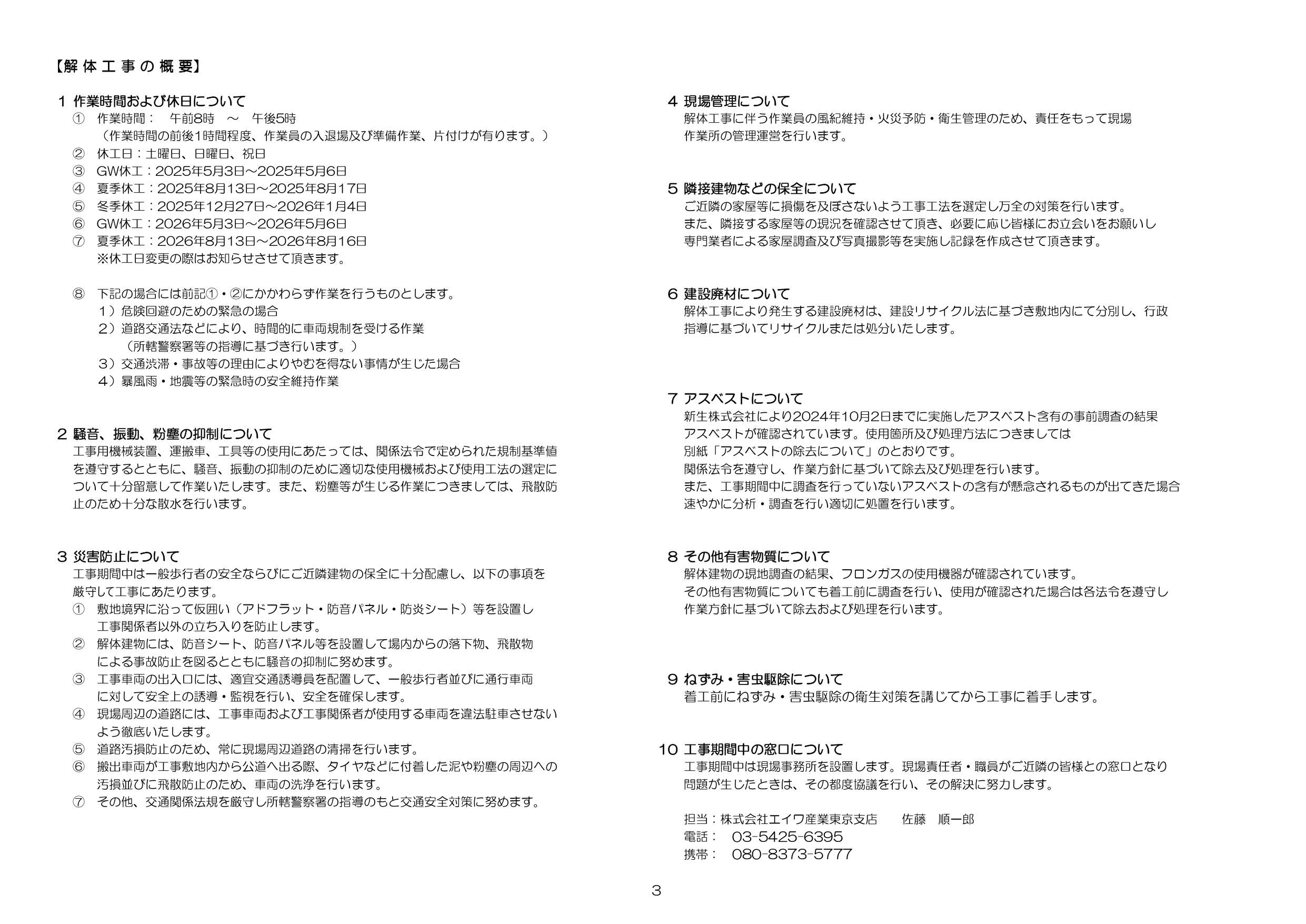KENWOODビルの解体工事について 2025/3/20 一年程度かけて解体するそうです。石川公園前の道路を車両が通りますので、お気を付けください。詳細は資料を見てください。p1 P2 P3 P4 P5 P6