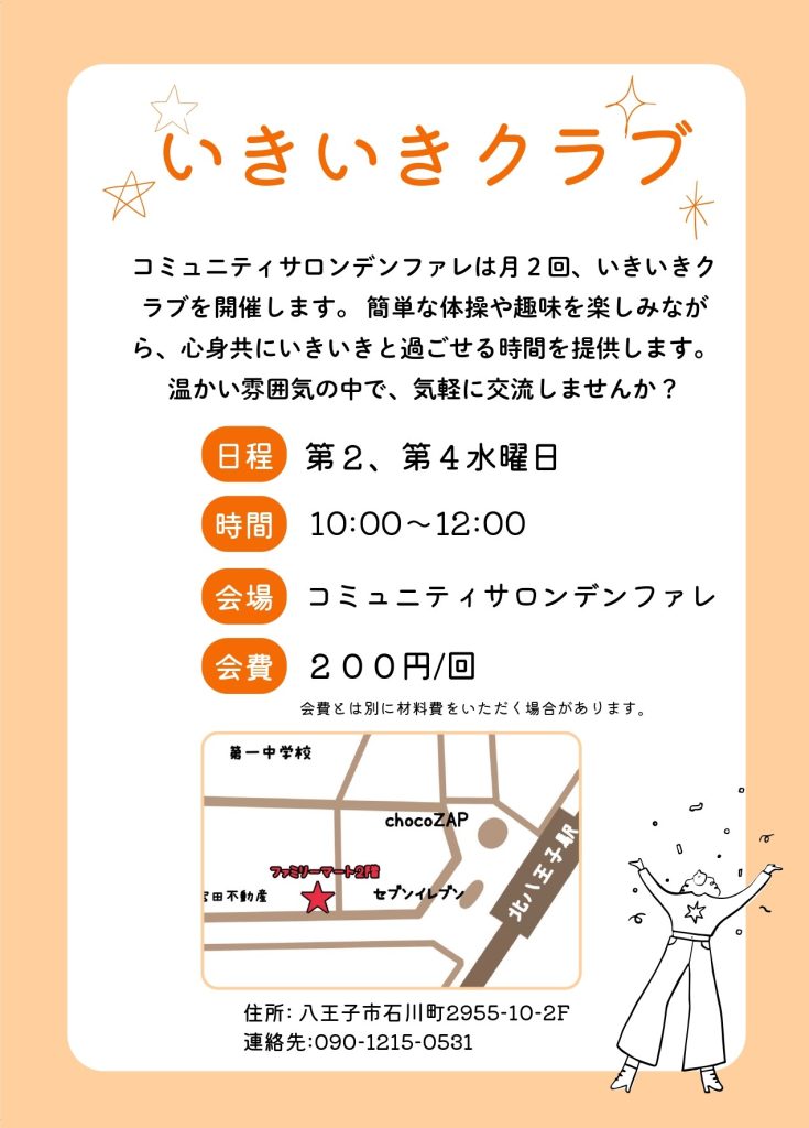 新しいサロンがオープンしました! 2025/4/16 この度、北八王子駅前に心と身体を癒す新しいサロンがオープンしました。エッセンシャルオイルを使った施術で、リラックスした時間を過ごせるほか、レンタルスペース、地域の高齢者の方々の憩いの場としてもご利用いただけます。軽い体操や交流の時間もあり、無理なく楽しく健康づくりができる場となっています。日々の暮らしにちょっとした“癒やし”と“元気”をプラスしませんか?どなたでもお気軽にお立ち寄りください。コミュニティサロンデンファレ 坂本チラシ