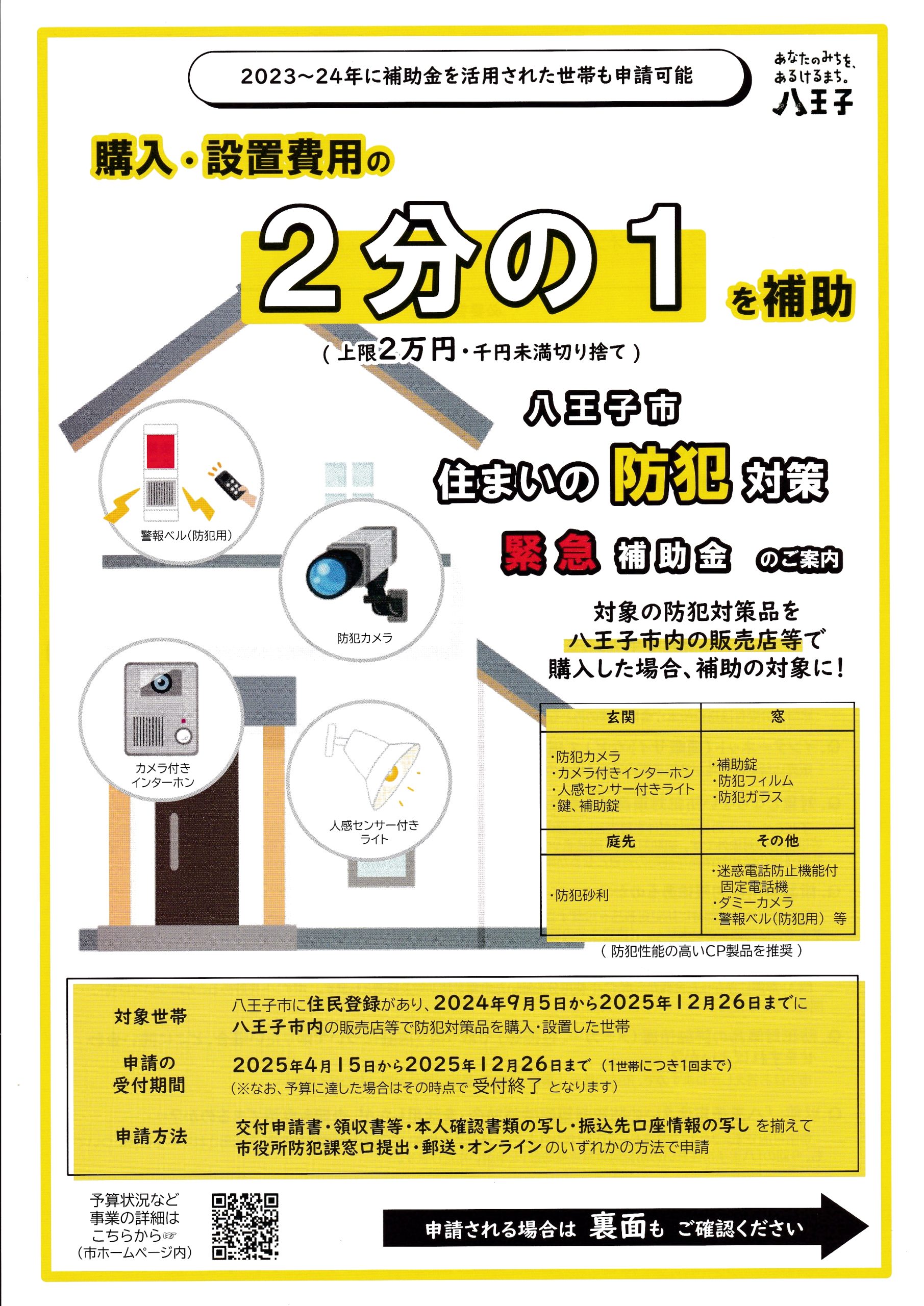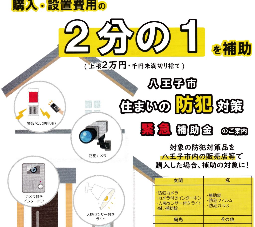 玄関の、防犯カメラ・カメラ付きインターホン・人感センサー付きライト・鍵、補助錠や、窓の防犯フィルム、庭先の防犯砂利などの購入、設置費用の2分の1が補助されます。(上限2万円)
