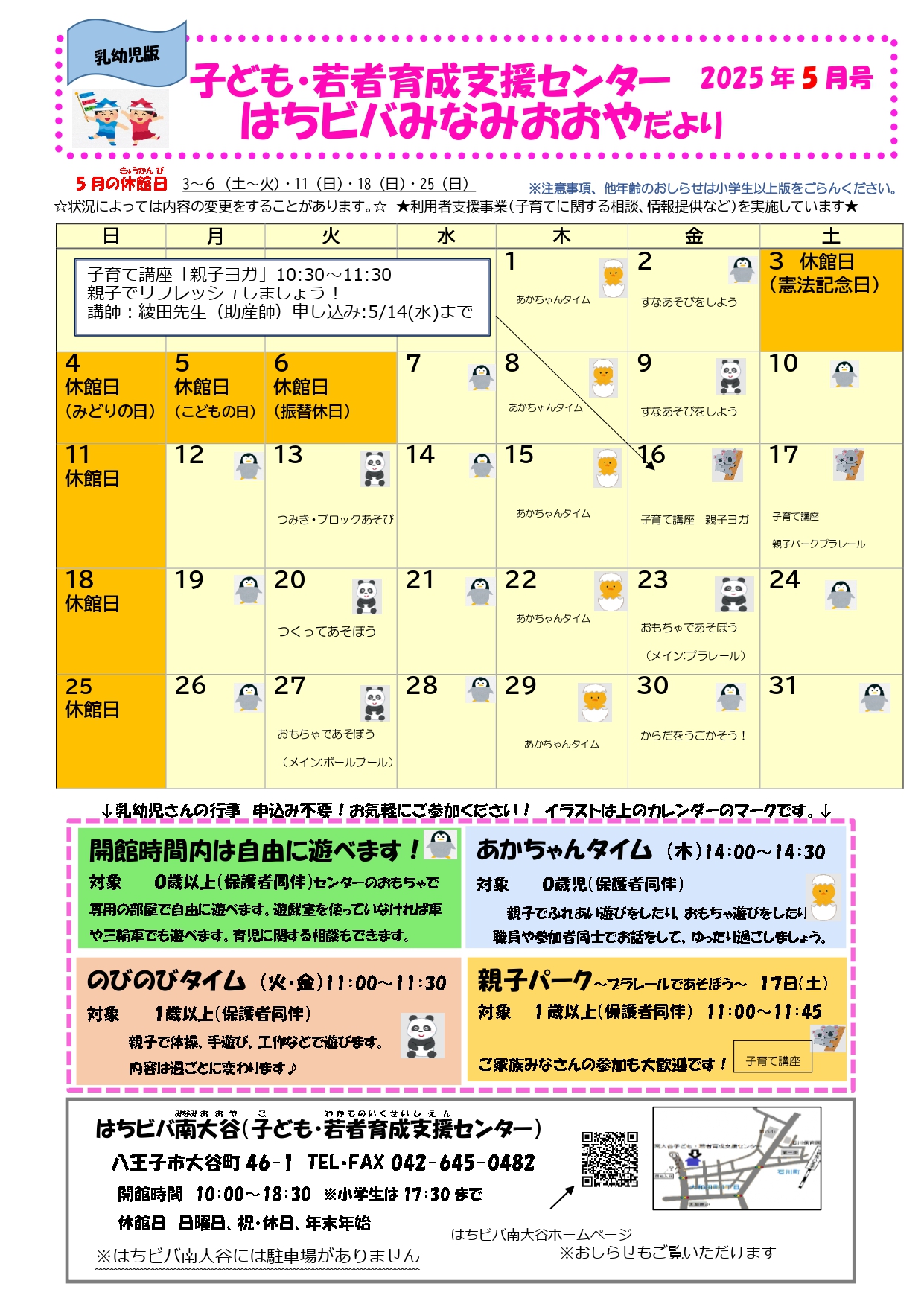 子ども・若者育成支援センターだより5月号 2025/4/26 はちビバで遊ぼう!タスケ、アナログゲーム、おしゃべり、おえかき、マンガを読む・・はちビバはみんなの居場所です。5月のカレンダーも見てね。はちビバみなみおおやだより P1 P2