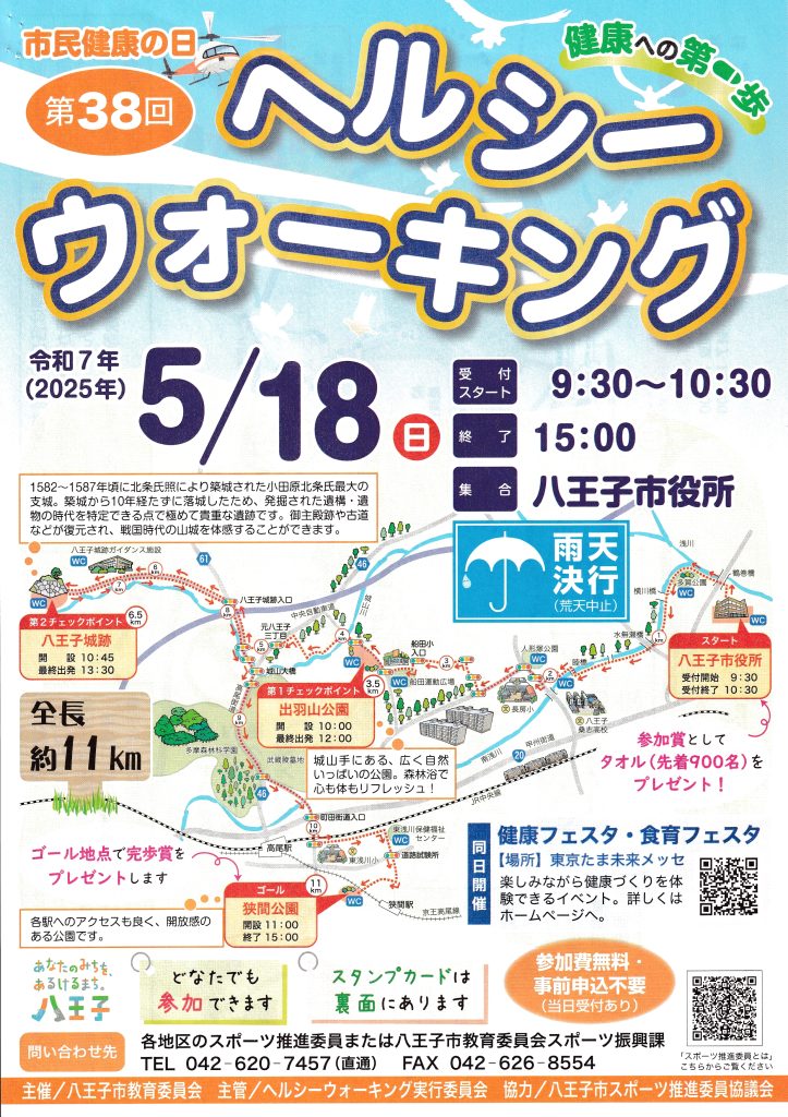 市民健康の日ヘルシーウォーキング5/18(日) 2025/4/26 2025/5/18(日)に行われる八王子市主催のウォーキングイベントです。全長11キロ。参加費無料、事前申込み不要。どなたでも参加できます。チラシはこちら 地図もあります。