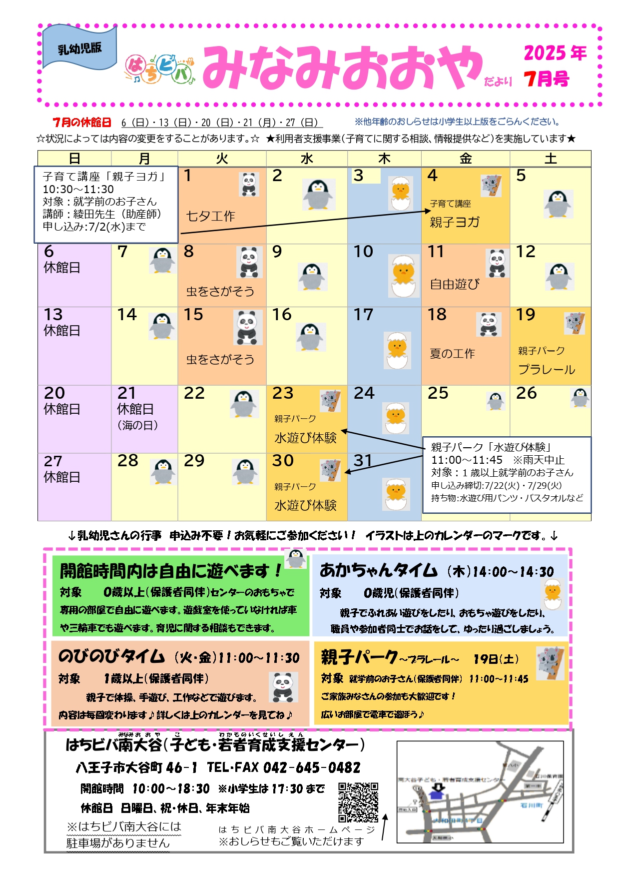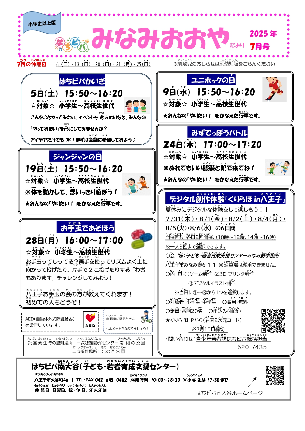 子ども・若者育成支援センターだより7月号 2025/6/27 はちビバ南大谷で遊ぼう!タスケ、アナログゲーム、おしゃべり、おえかき、マンガを読む・・はちビバはみんなの居場所です。ユニホックの日・ジャンジャンの日・デジタル創作体験・7月のカレンダーも見てね。はちビバみなみおおやだより P1 P2