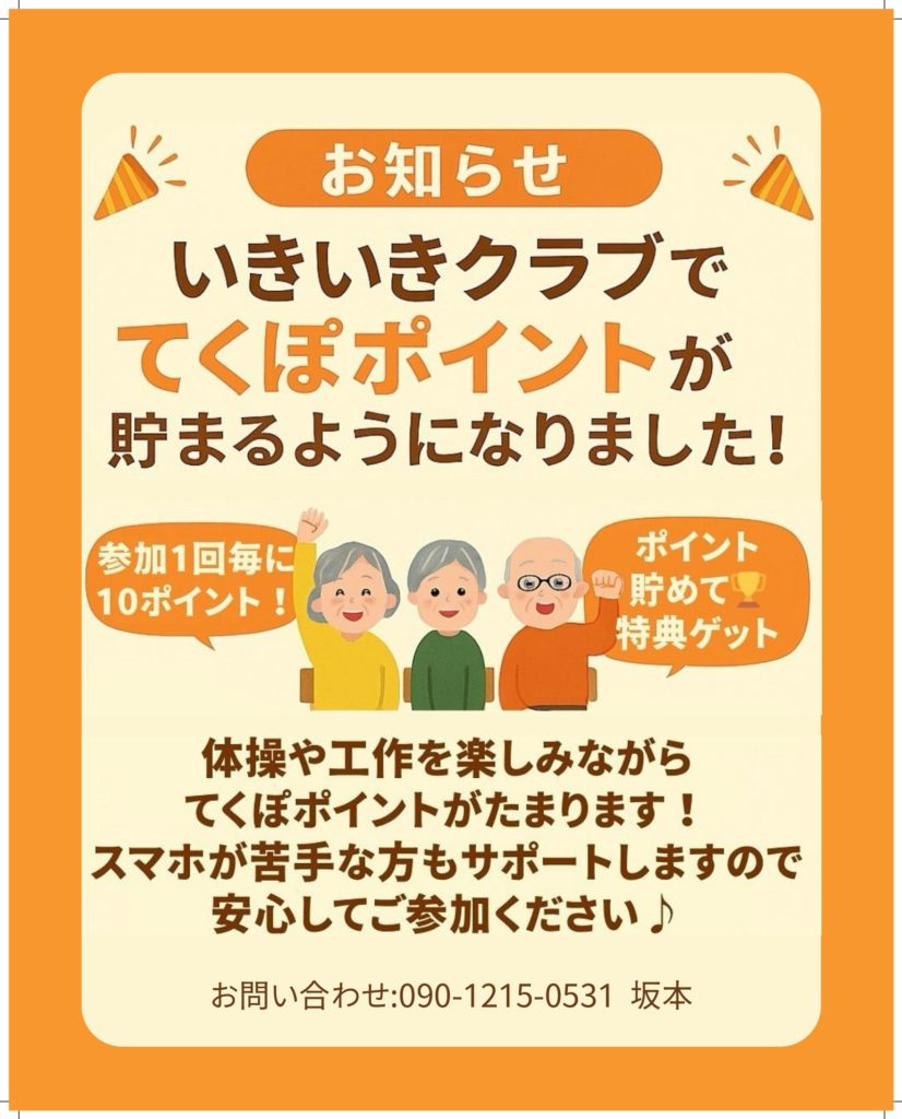 いきいきクラブで、てくぽポイントが貯まるようになりました。参加1回毎に10ポイント!