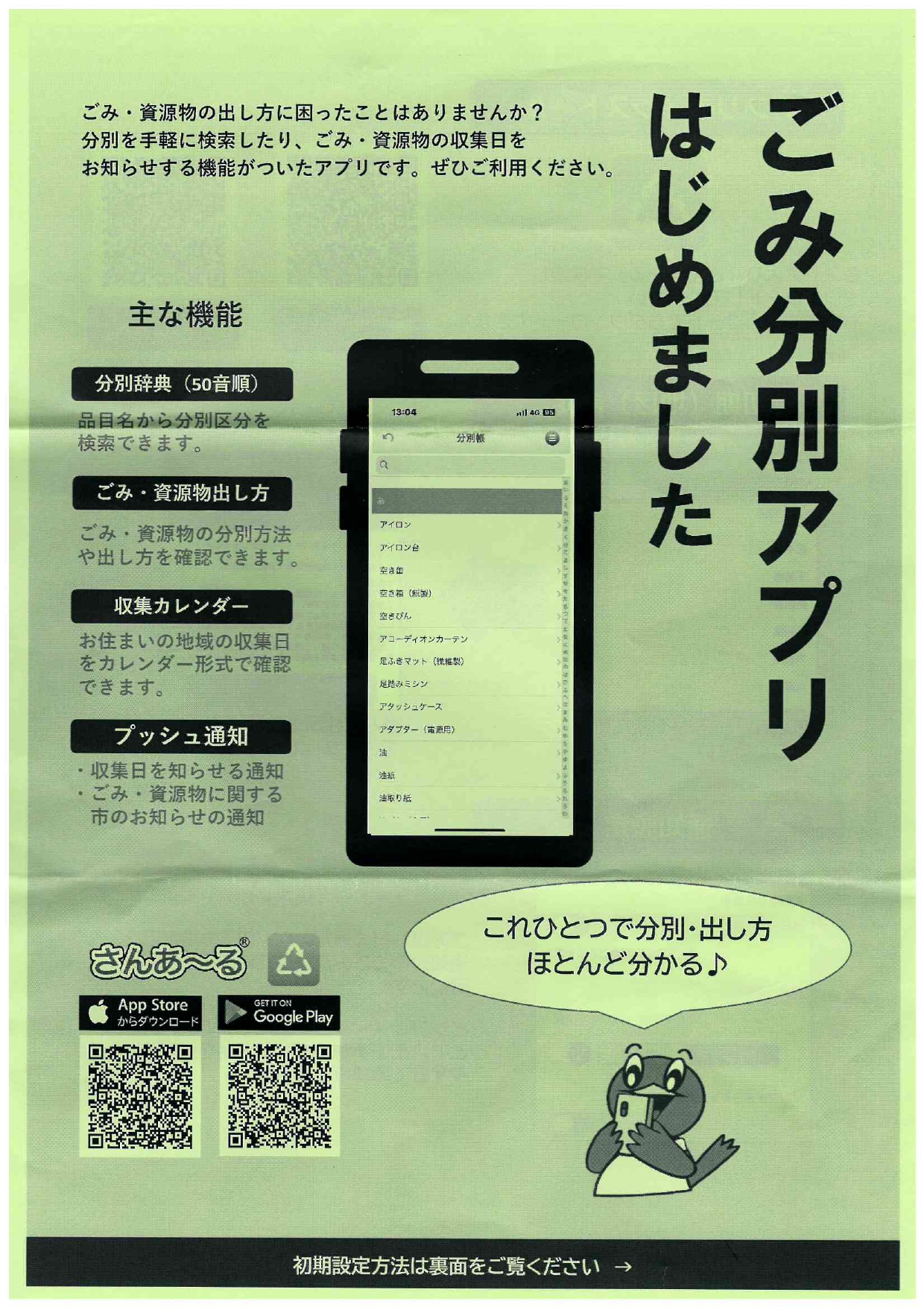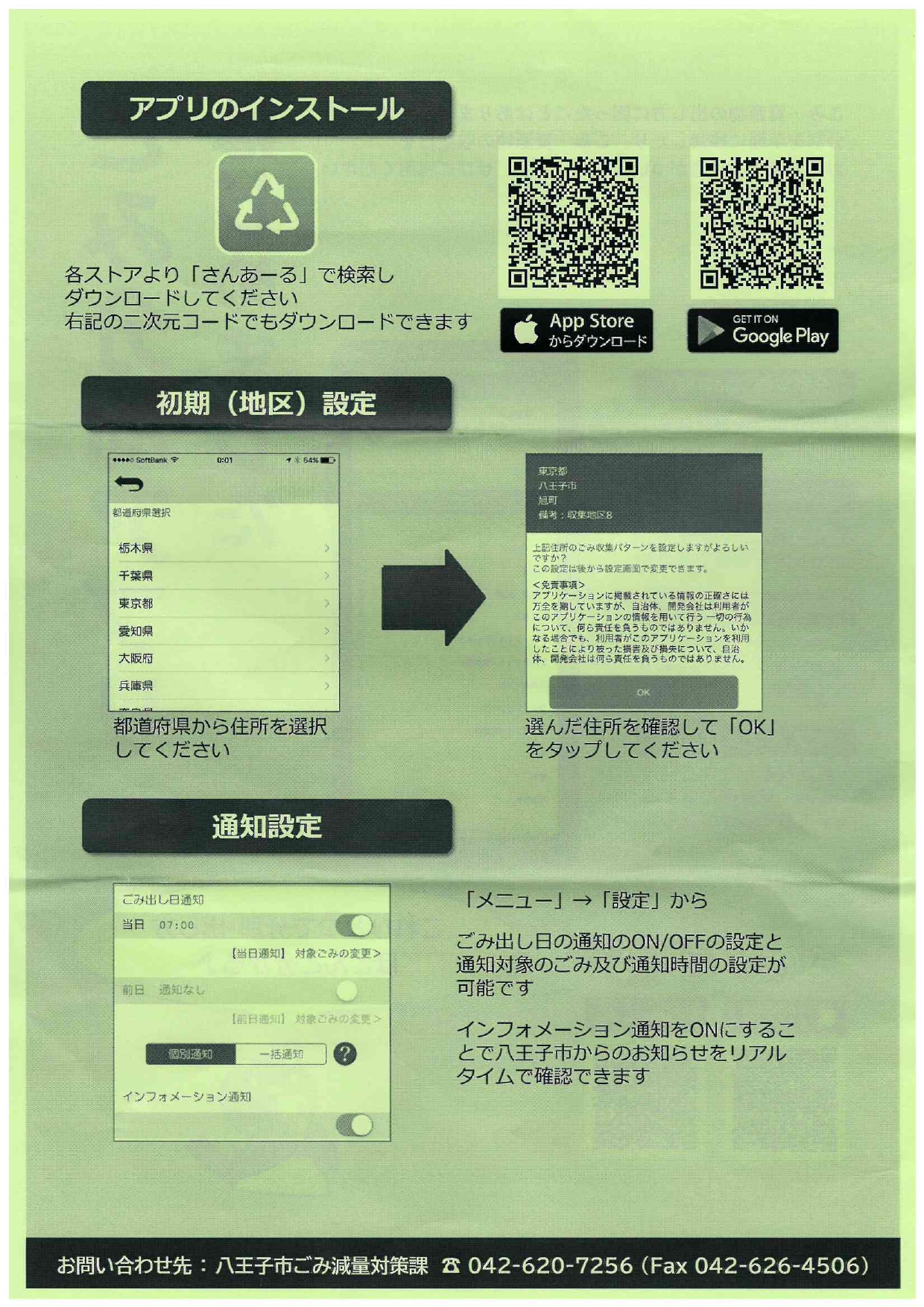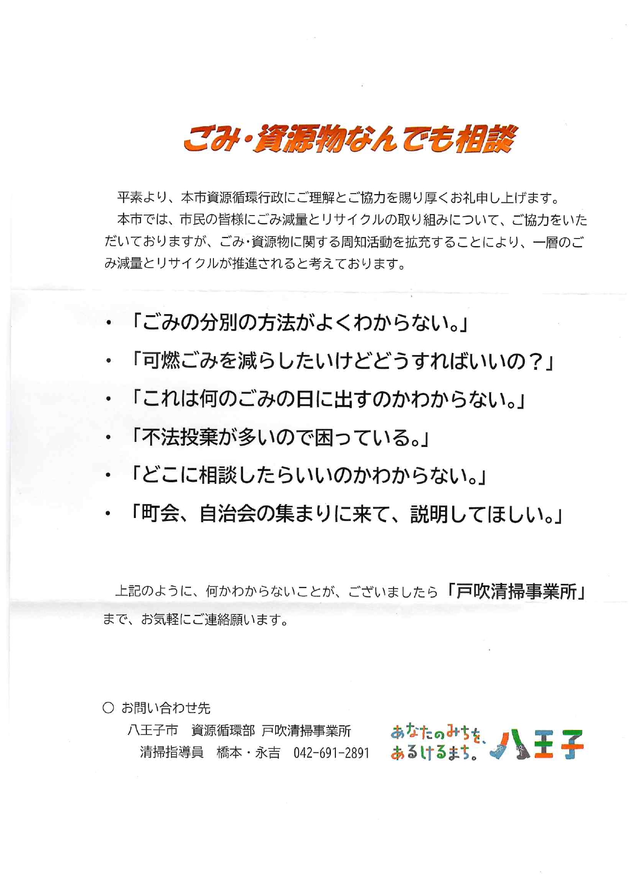 ごみ・資源物なんでも相談 2025/7/17 八王子市役所より、「ごみ・資源物なんでも相談」のお知らせです。・ごみの出し方や不法投棄など、「戸吹清掃事業所」へなんでもご相談ください。チラシ・ゴミ分別アプリはじめました。アプリ「さんあ~る」ごみの分別、ごみの出し方、収集カレンダー・プッシュ通知など、便利な機能。チラシ P1 P2