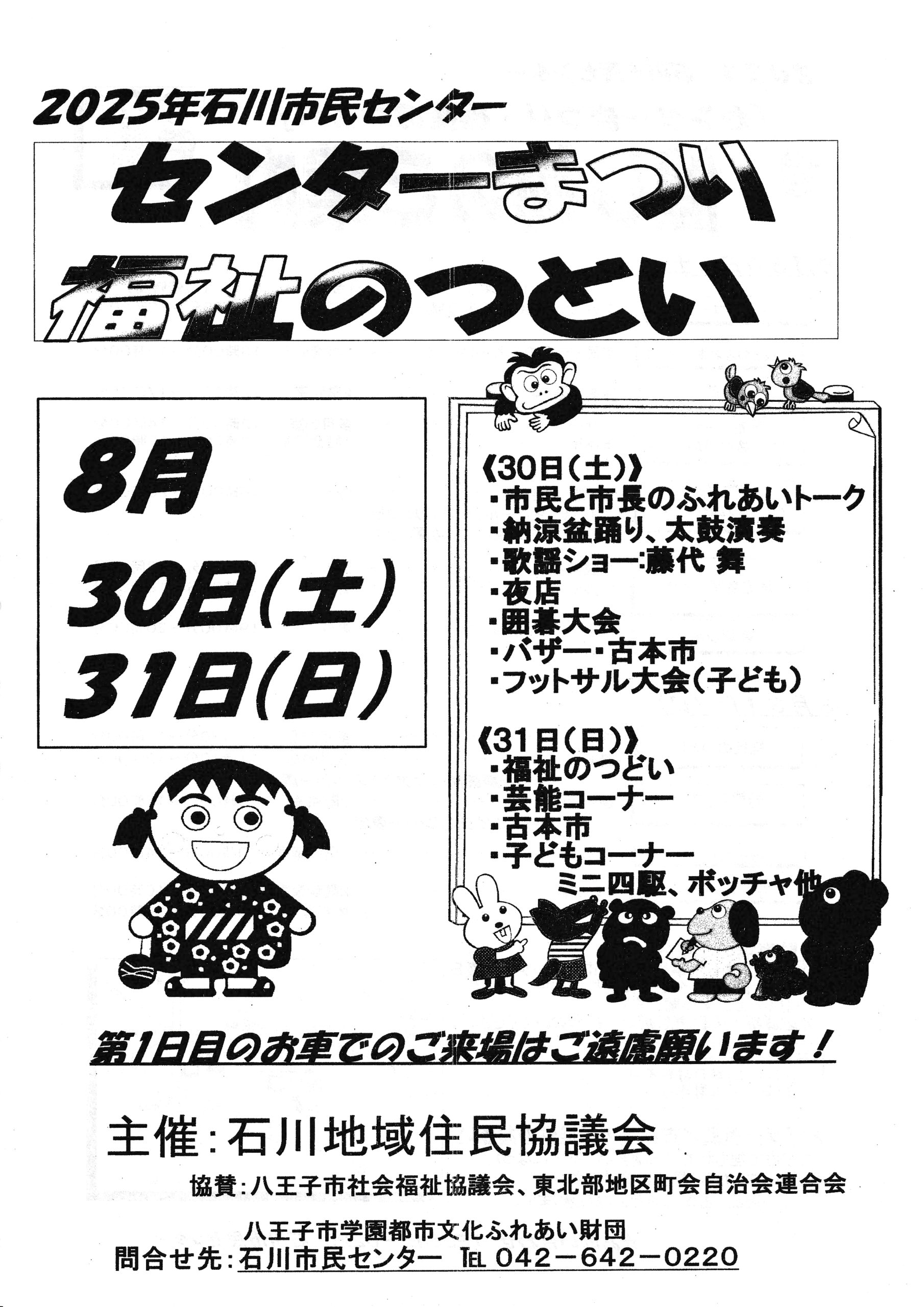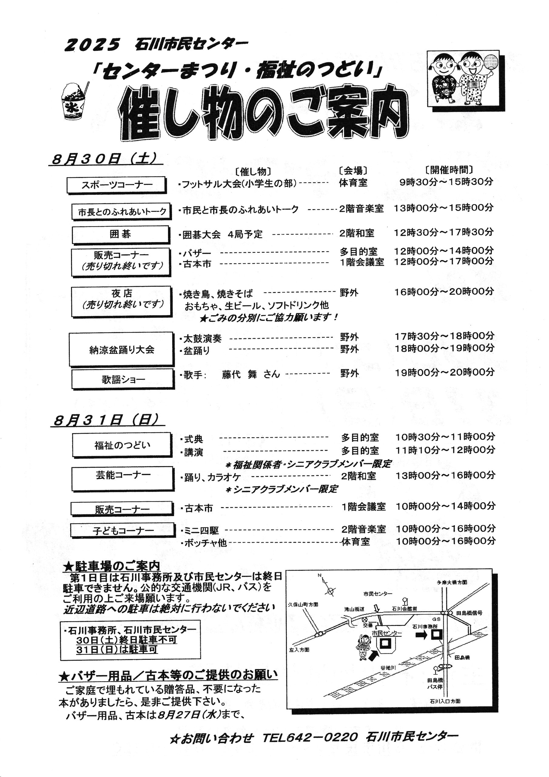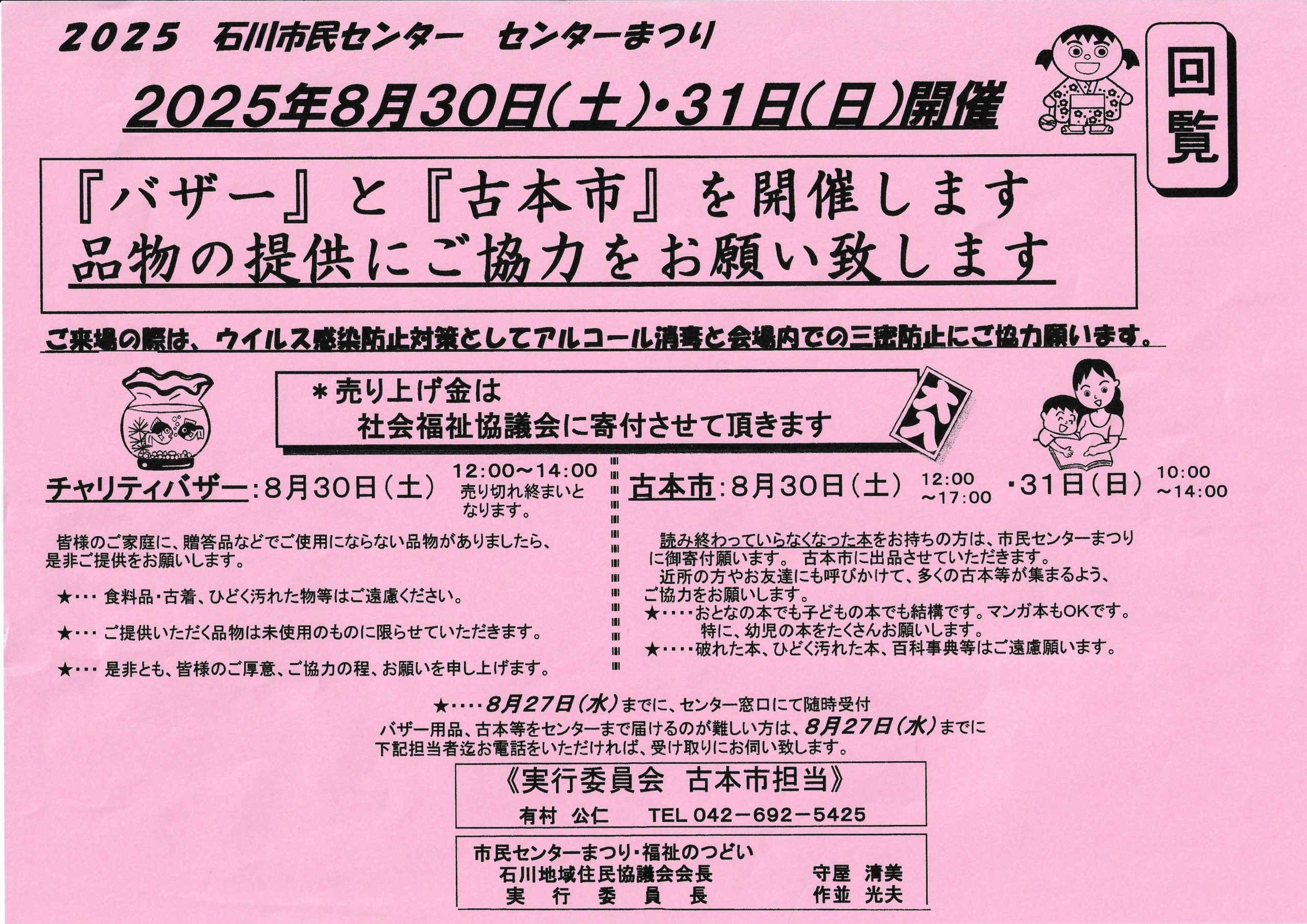 石川市民センター祭り福祉のつどい 2025/7/23 石川市民センター「センターまつり」が8月30日(土)・31日(日)に開催されます。詳しくは 催し物のご案内チラシはこちらバザー用品・古本等のご提供のお願い