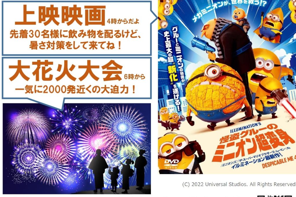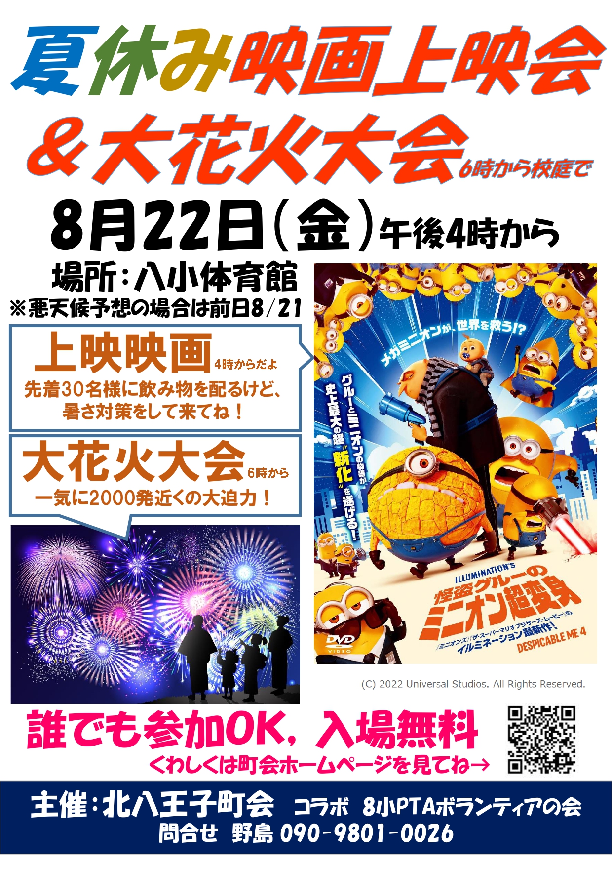 来てね!夏休み映画上映会&大花火大会 2025/8/14 今年は夏休み映画上映会と大花火大会を同日に開催します。8月22日(金)午後4時~ 体育館にて映画上映会「怪盗グルーのミニオン超変身」午後6時~ 校庭にて花火大会北八町会と8小PTAボランティアの会のコラボ企画です。たくさんの方のご来場をお待ちしております。ポスターはこちら