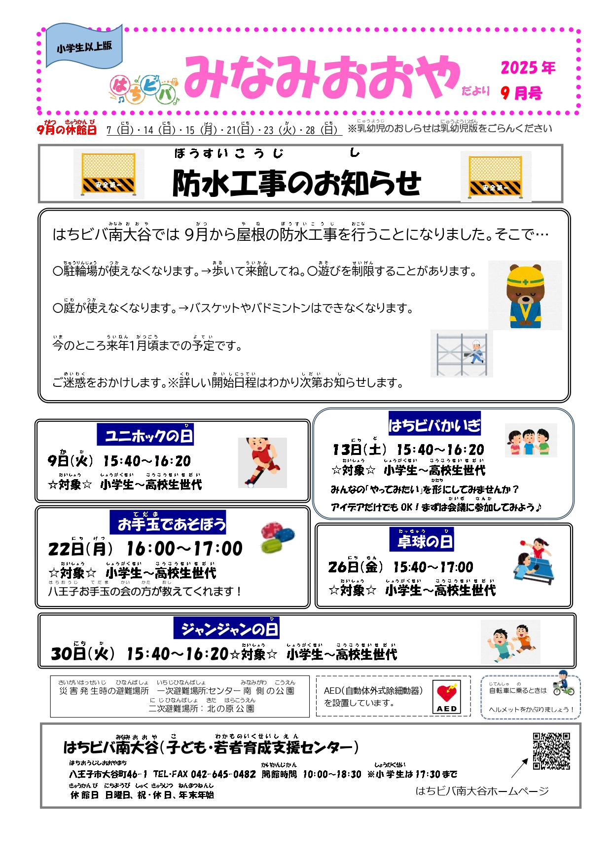 子ども・若者育成支援センターだより9月号 2025/8/27 はちビバ南大谷で遊ぼう!屋根の防水工事のお知らせ。ユニホックの日・ジャンジャンの日・お手玉であそぼう・卓球の日・・はちビバはみんなの居場所です。8月のカレンダー。はちビバ南大谷だより P1 P2