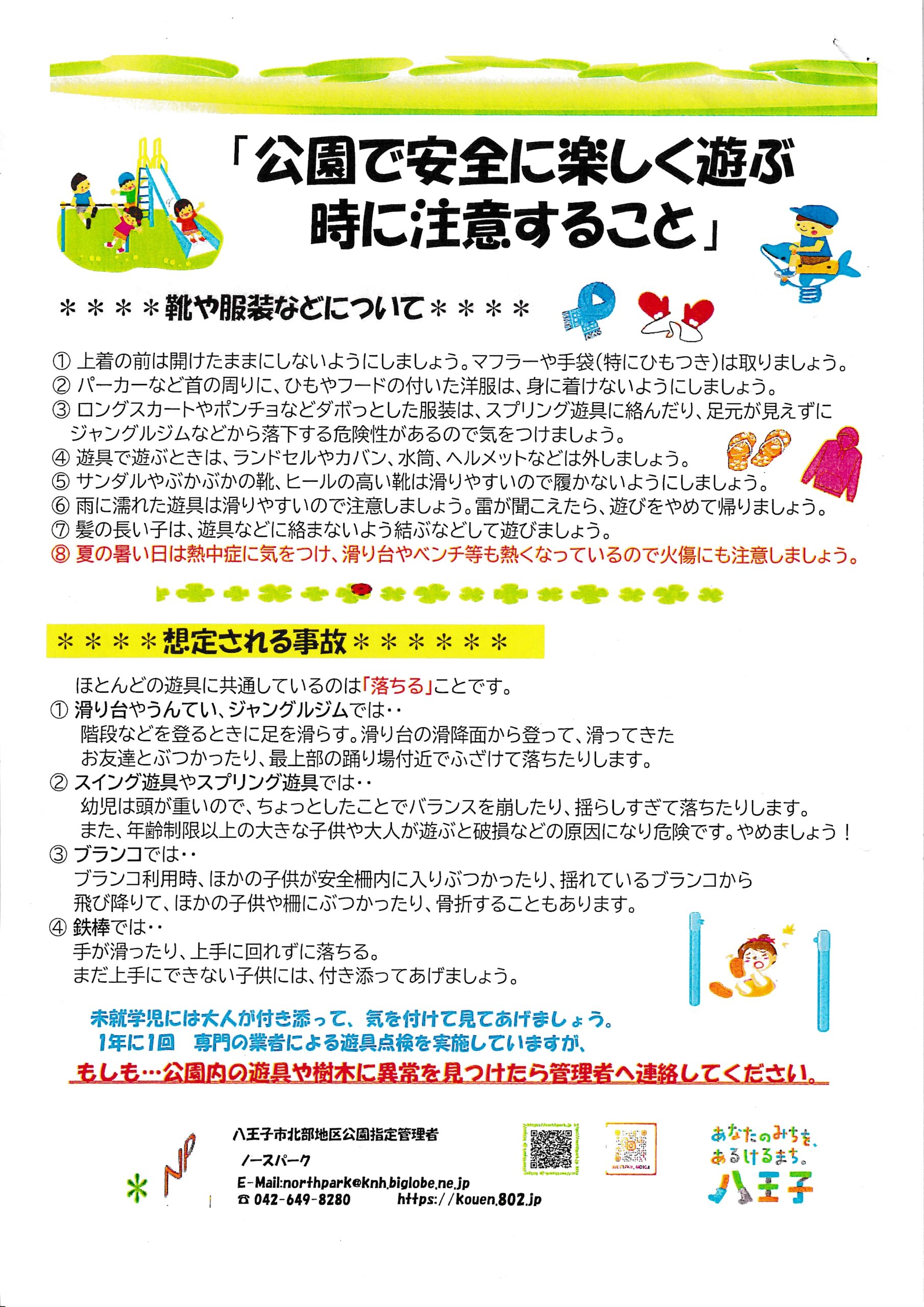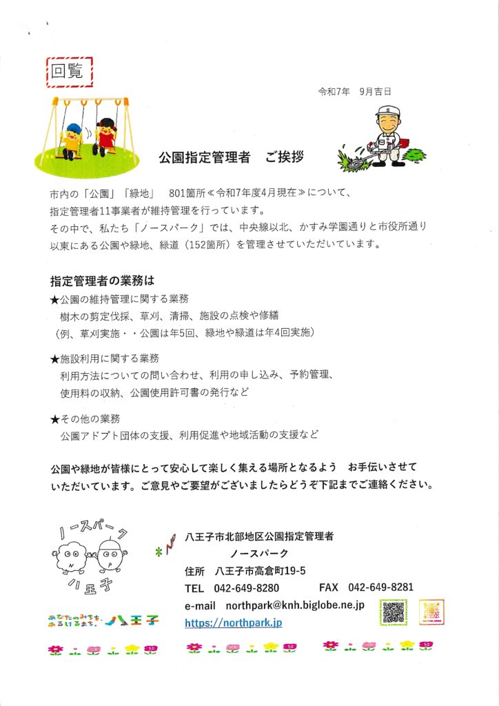 公園指定管理者ノースパークから 2025/9/1 八王子市北部地区公園指定管理者「ノースパーク」より、ご挨拶とお知らせです。「指定管理者の業務」「公園で安全に楽しく遊ぶ時に注意すること」「八王子市公園アドプト制度のご案内」チラシはこちら P1 P2 P3 P4