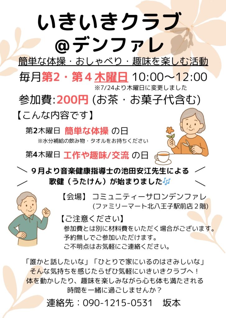 コミュニティーサロン・デンファレの、いきいきクラブからお知らせです。