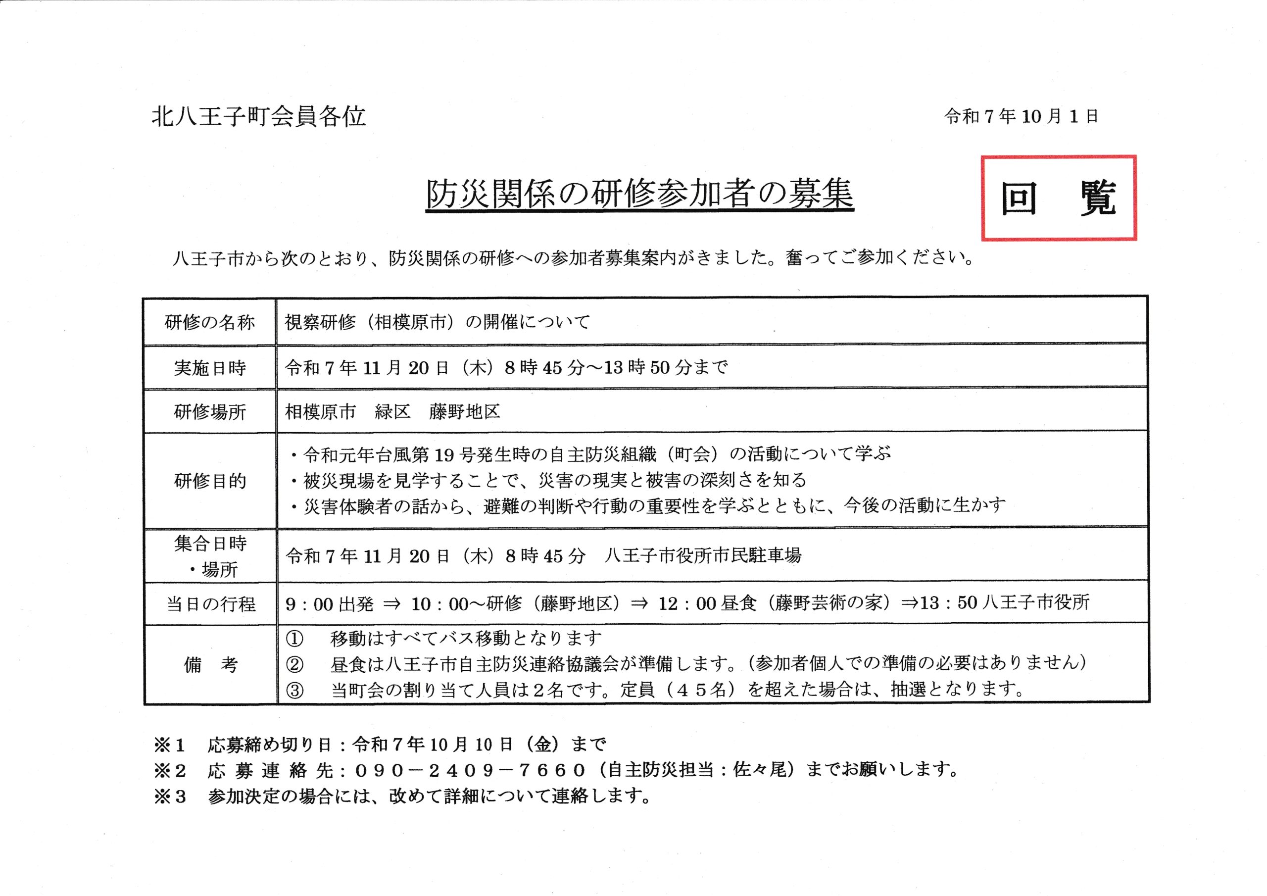 防災関係の研修参加者の募集 2025/9/26 八王子市から、防災に関する研修会への参加募集案内です。奮ってご参加ください。■研修の名称 視察研修(相模原市)の開催について■研修内容 自主防災の活動について災害現場 災害体験者 詳しくは別紙参照■日時令和7年11月20日(木)8:45~13:50■集合場所 令和7年11月20日(木) 8:45八王子市役所市民駐車場★締め切り 10月10日(金) 自主防災担当:佐々尾 090-2409-7660