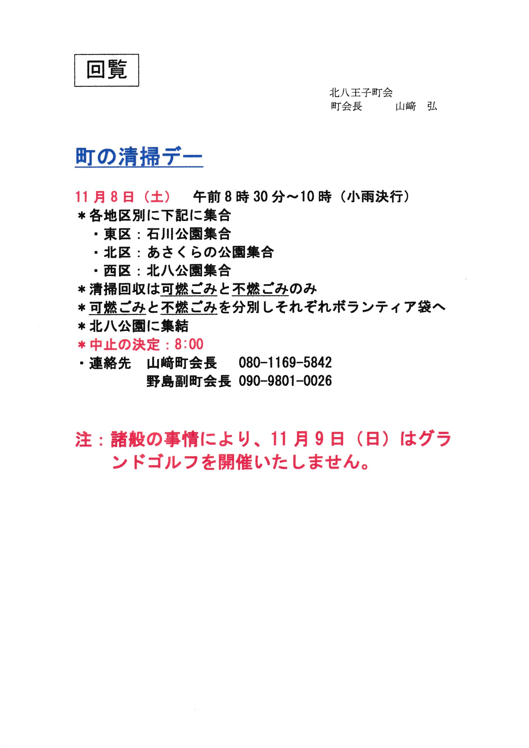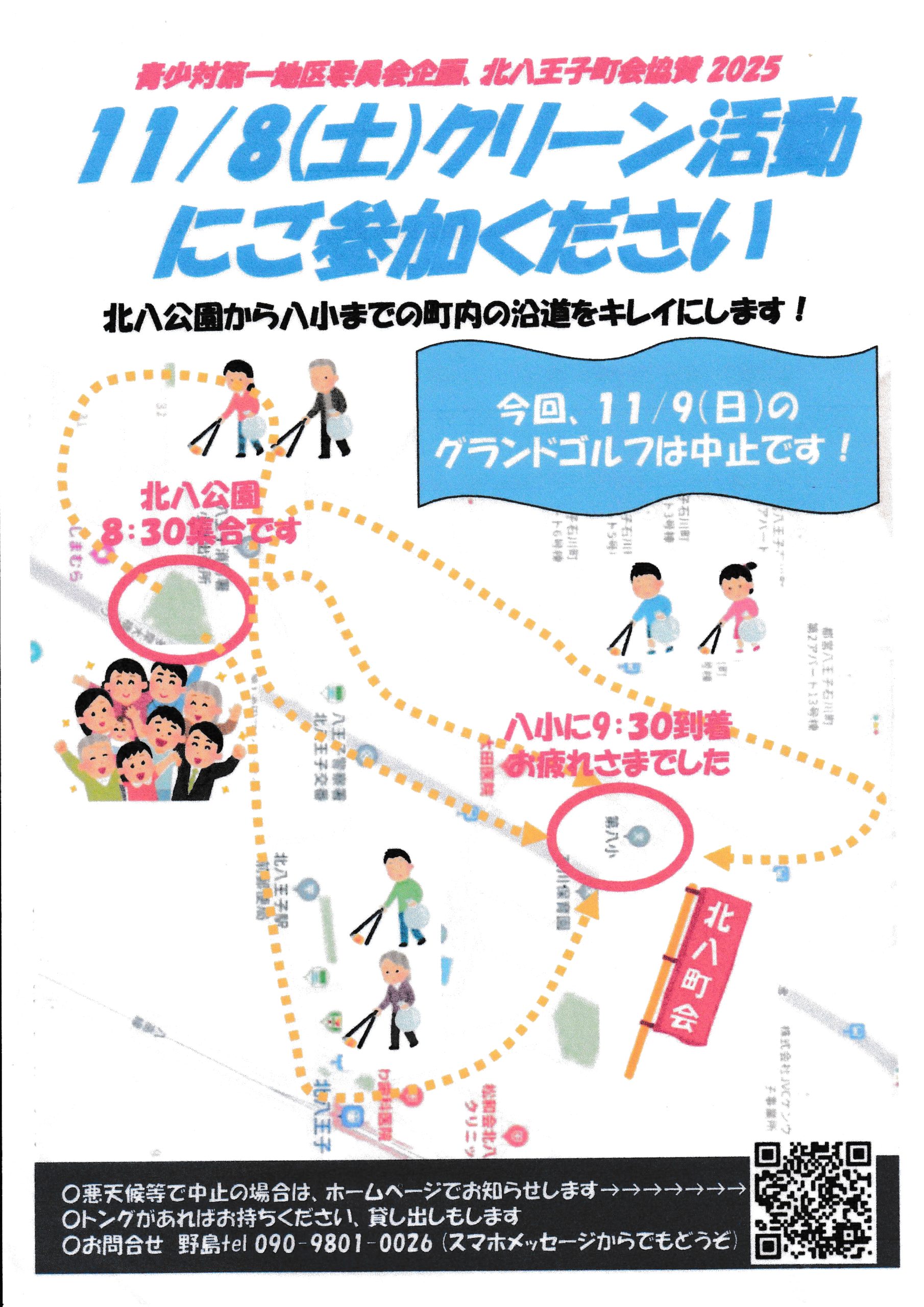 11/8(土)クリーン活動にご参加ください 2025/10/12 回覧およびホームページの集合場所に誤りがありました。大変申し訳ございませんでした。(2025/11/9 追記)11月8日(土)8時30分~10時(小雨決行)東区:石川公園集合北区:あさくらの公園集合西区:北八公園集合集合は北八公園中止の場合は8時にホームページでお知らせします。なお、諸般の事情により、11月9日(日)のグランドゴルフは開催いたしません。ポスターはこちら。回覧はこちら。