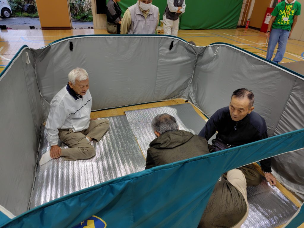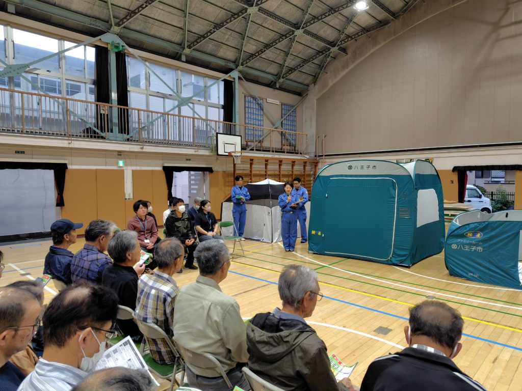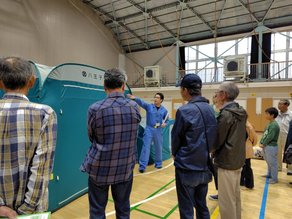 八王子市役所防災課の方々に、第八小学校体育館に来ていただき、実際に避難所となった時に使用する、マットや毛布、組み立てたテントを紹介していただきました。