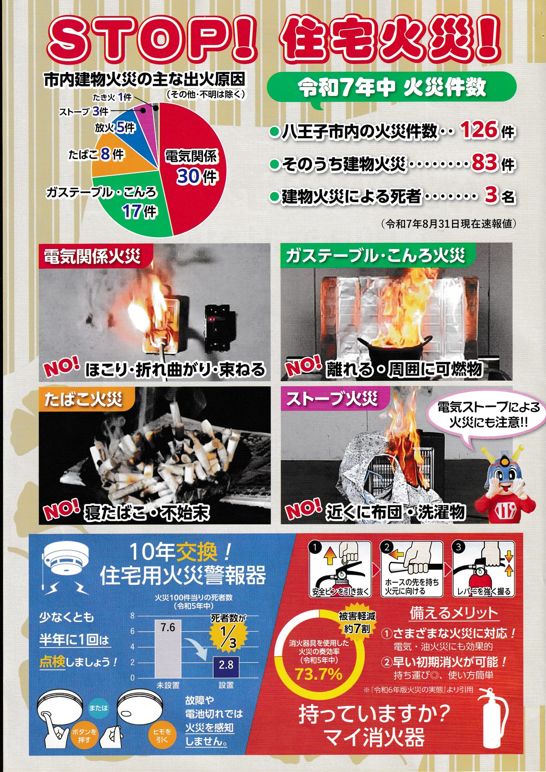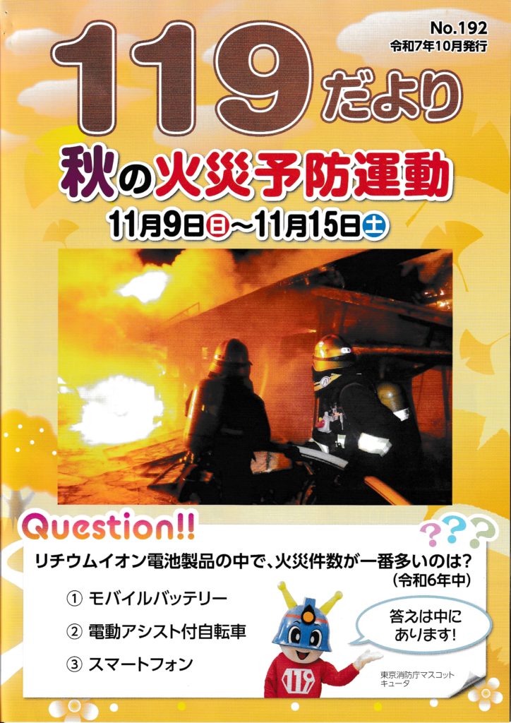 秋の火災予防運動 2025/10/28 八王子防火防災協会より「秋の火災予防運動11/9~11/15」STOP! 住宅火災!リチウムイオン電池に起因する火災が、近年急増しています。ぜひ、ご覧ください。119だより P1 P2 P3 P4