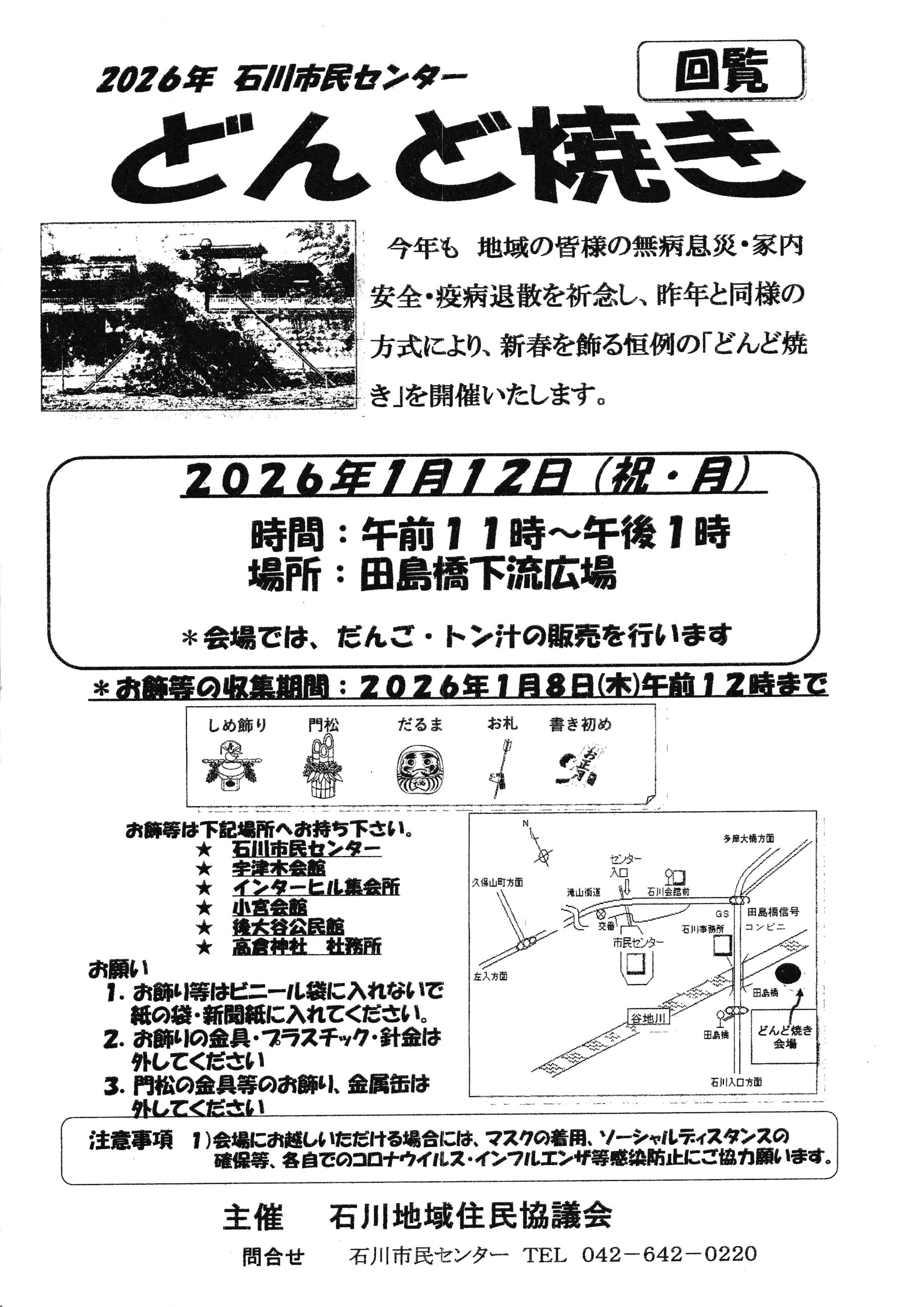 どんど焼きのお知らせ 2025/12/2 年明け恒例の「どんど焼き」のお知らせです。2026年1月12日(祝・月)午前11時~午後1時田島橋下流広場主催:石川地域住民協議会だんご・豚汁の販売もあります。チラシはこちら