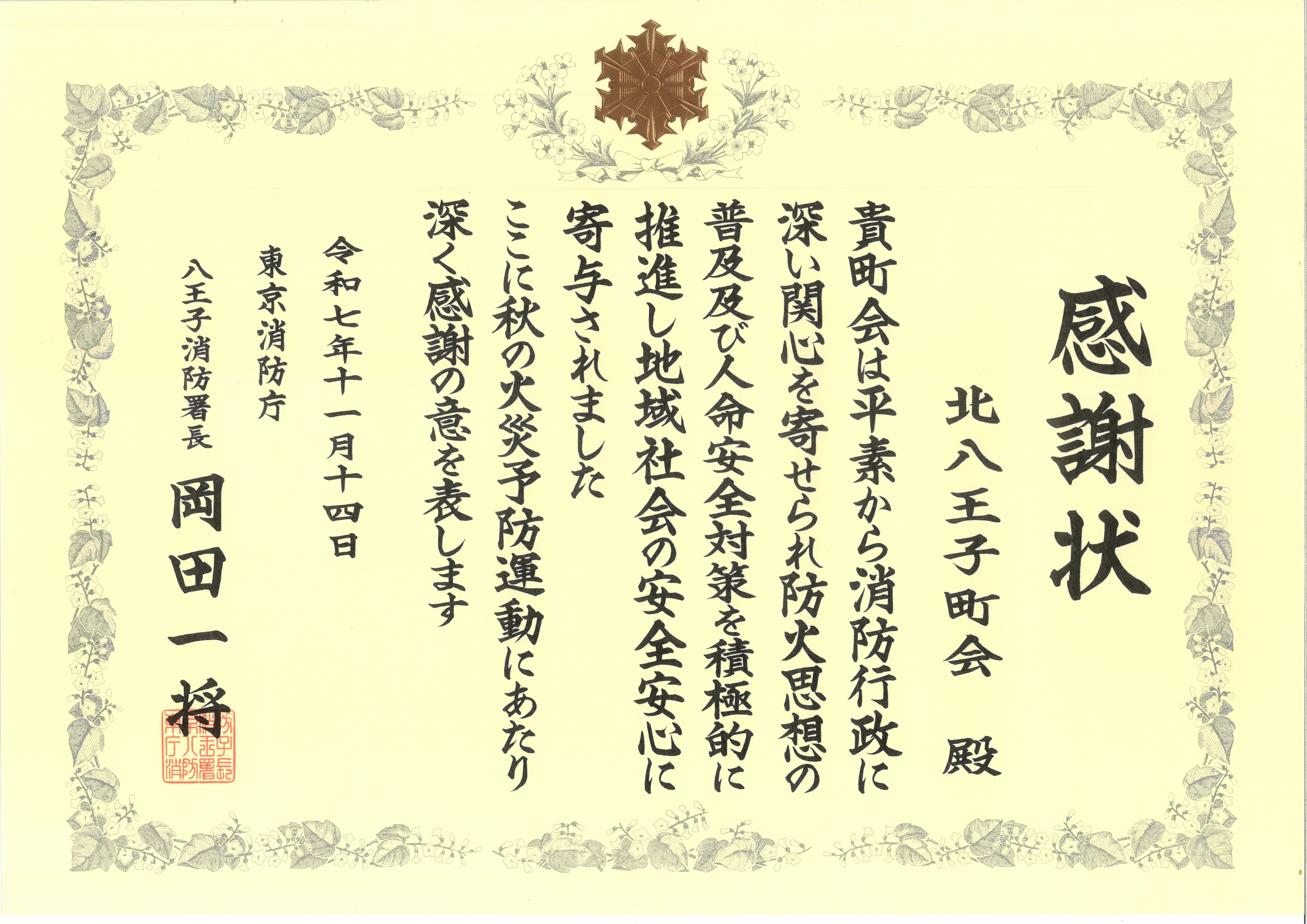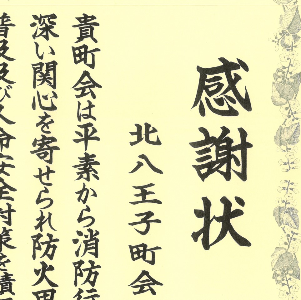 消防署から感謝状をいただきました 2025/12/8 北八王子町会は、令和7年11月14日「人命安全対策等推進功労」の表彰を受けました。今後も、町会員の皆様と共に、防災訓練などを通して、防災に対する意識を高めてまいります。変わらぬご協力をお願いいたします。感謝状はこちら JPG PDF