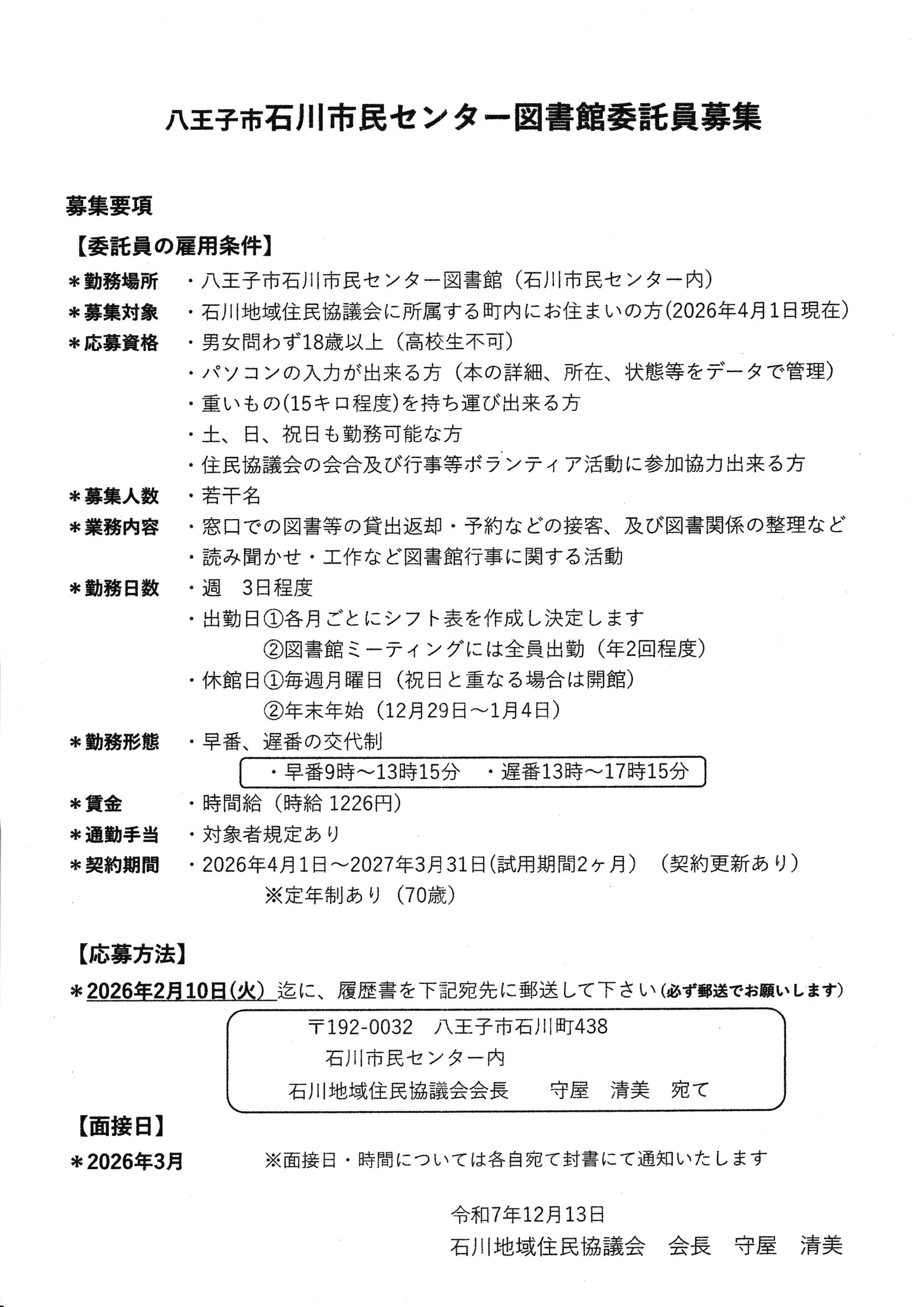 石川市民センター図書館委託員を募集 2025/12/17 石川市民センターの図書館委託員募集のお知らせです。業務内容は、窓口での図書等の貸出返却・予約などの接客、及び図書関係の整理など。読み聞かせ・工作など図書館行事に関する活動。詳しくはこちら。