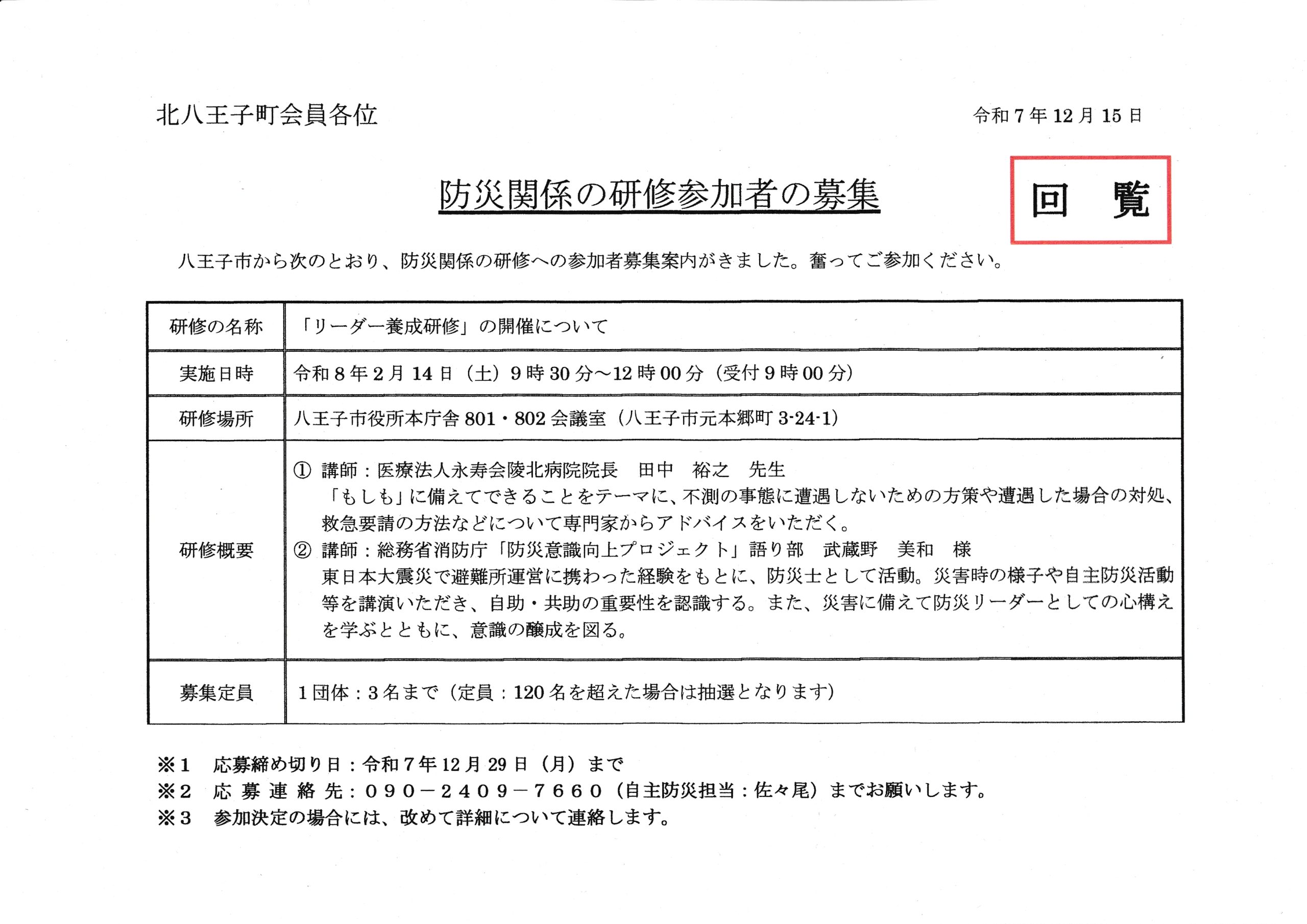 防災関係の研修参加者の募集 2025/12/17 八王子市より、防災関係の研修参加者募集のお知らせです。奮ってご参加ください。名称:「リーダー養成研修」の開催について実施日時:令和8年2月14日(土) 9:30~12:00場所:八王子市役所本庁舎締め切り:令和7年12月29日担当:佐々尾 090-2409-7660回覧はこちら。