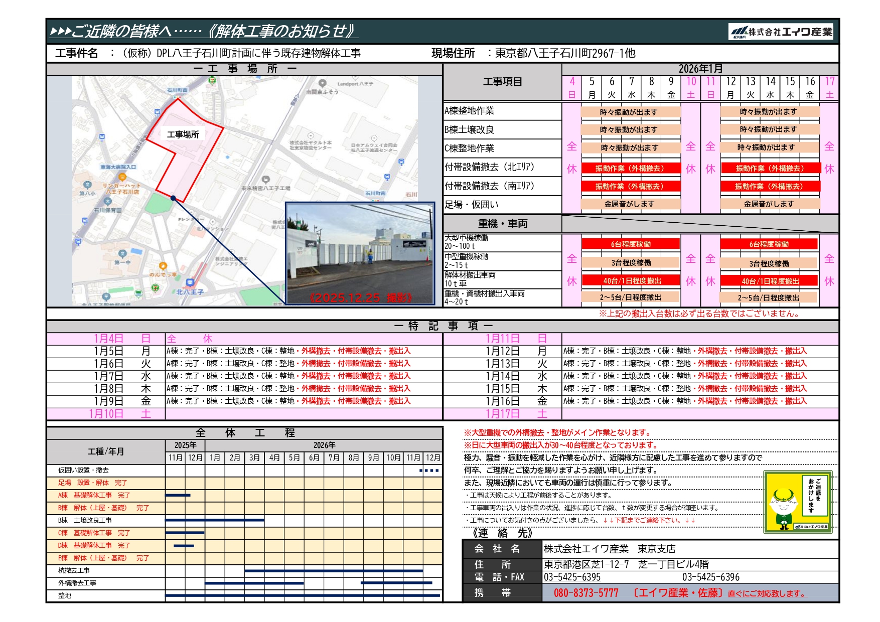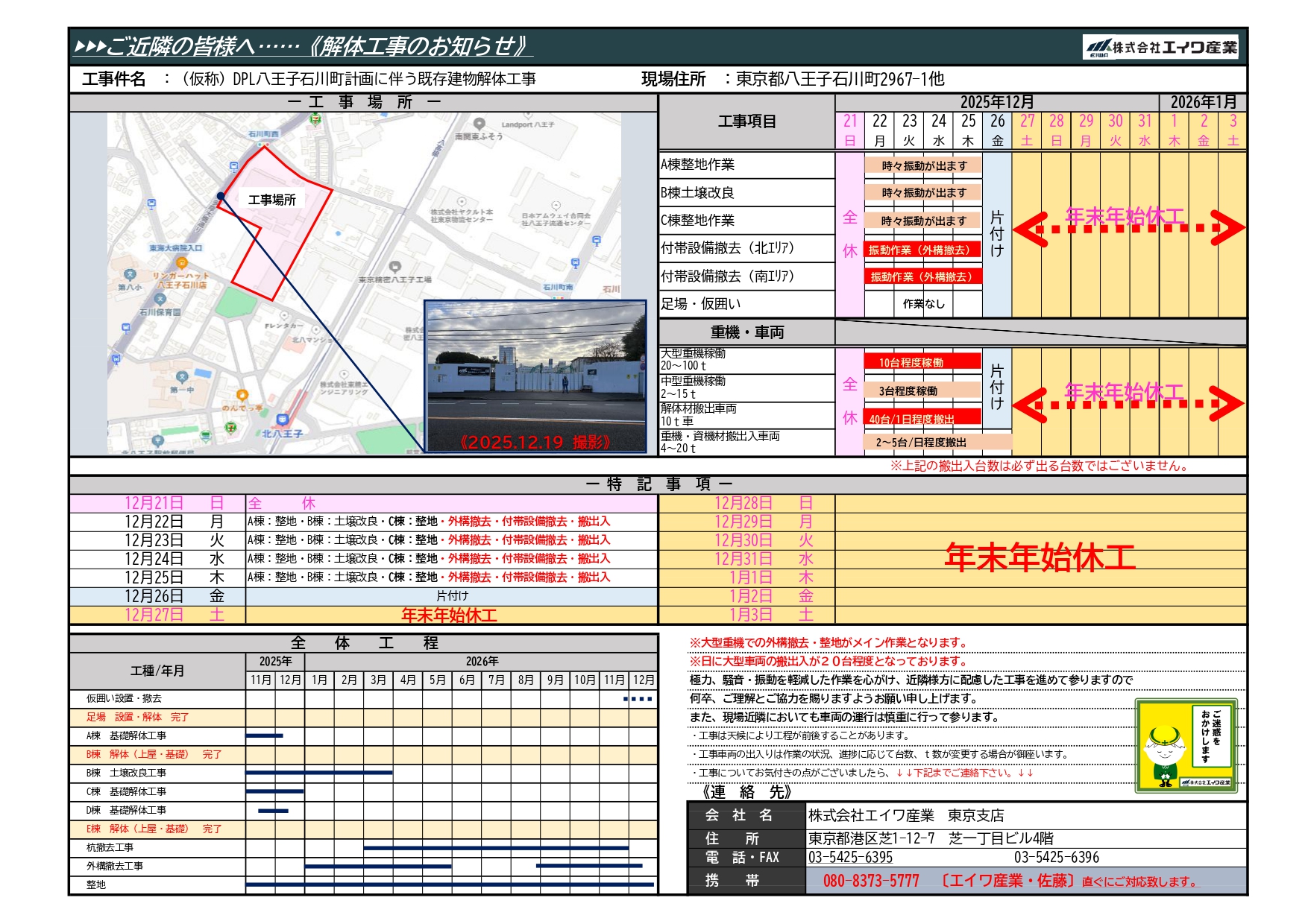 ケンウッド跡地の工事について(2) 2025/12/28 2025/12/21~2026/01/17の詳しい工事日程・内容について、(株)エイワ産業よりお知らせです。今後も2週間ごとにお知らせします。2025/12/21~2026/01/03 P1 P22026/01/04~2026/01/17 P1 P2