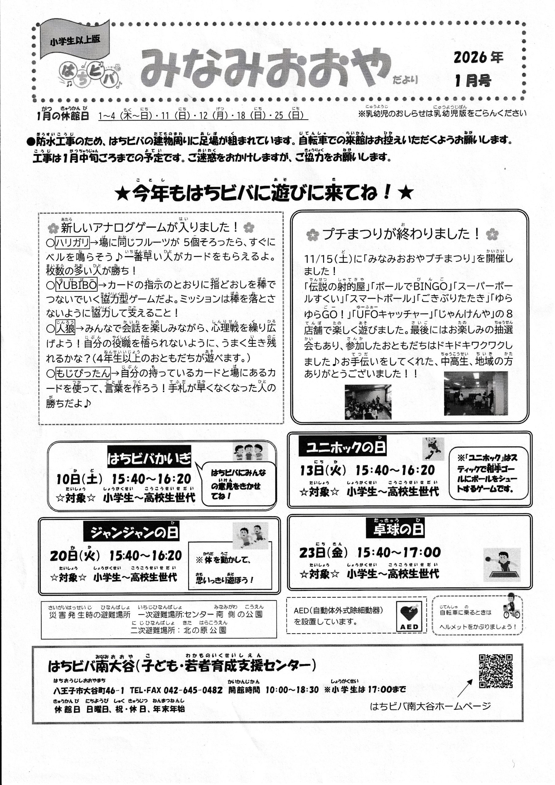 はちビバみなみおおやだより1月号 2025/12/28 はちビバ南大谷で遊ぼう!新しいアナログゲームが入りました!ユニホックの日・ジャンジャンの日・卓球の日はちビバ南大谷の乳幼児活動についてはちビバ南大谷だより 表 裏