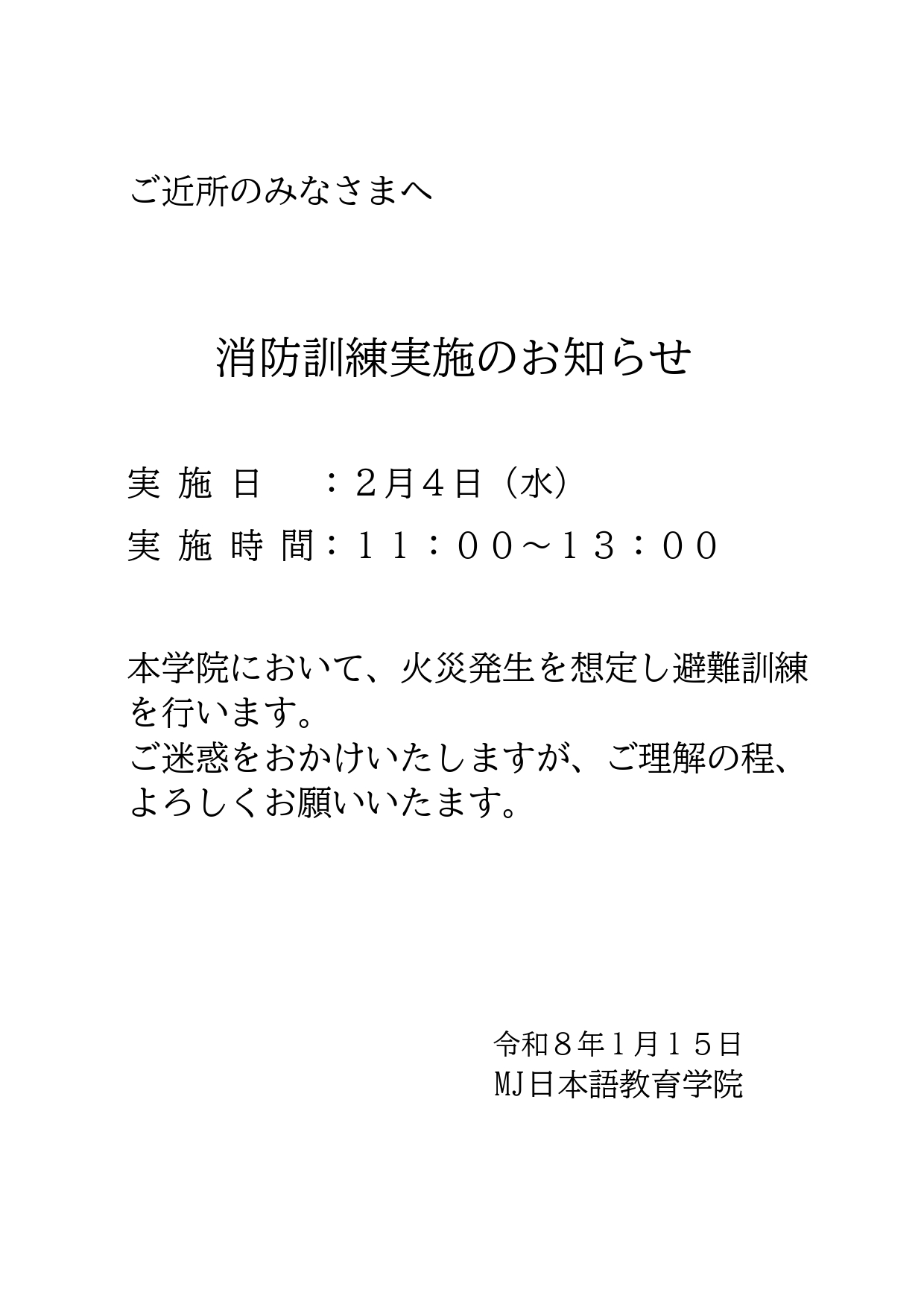 MJ日本語教育学院 消防訓練実施のお知らせ