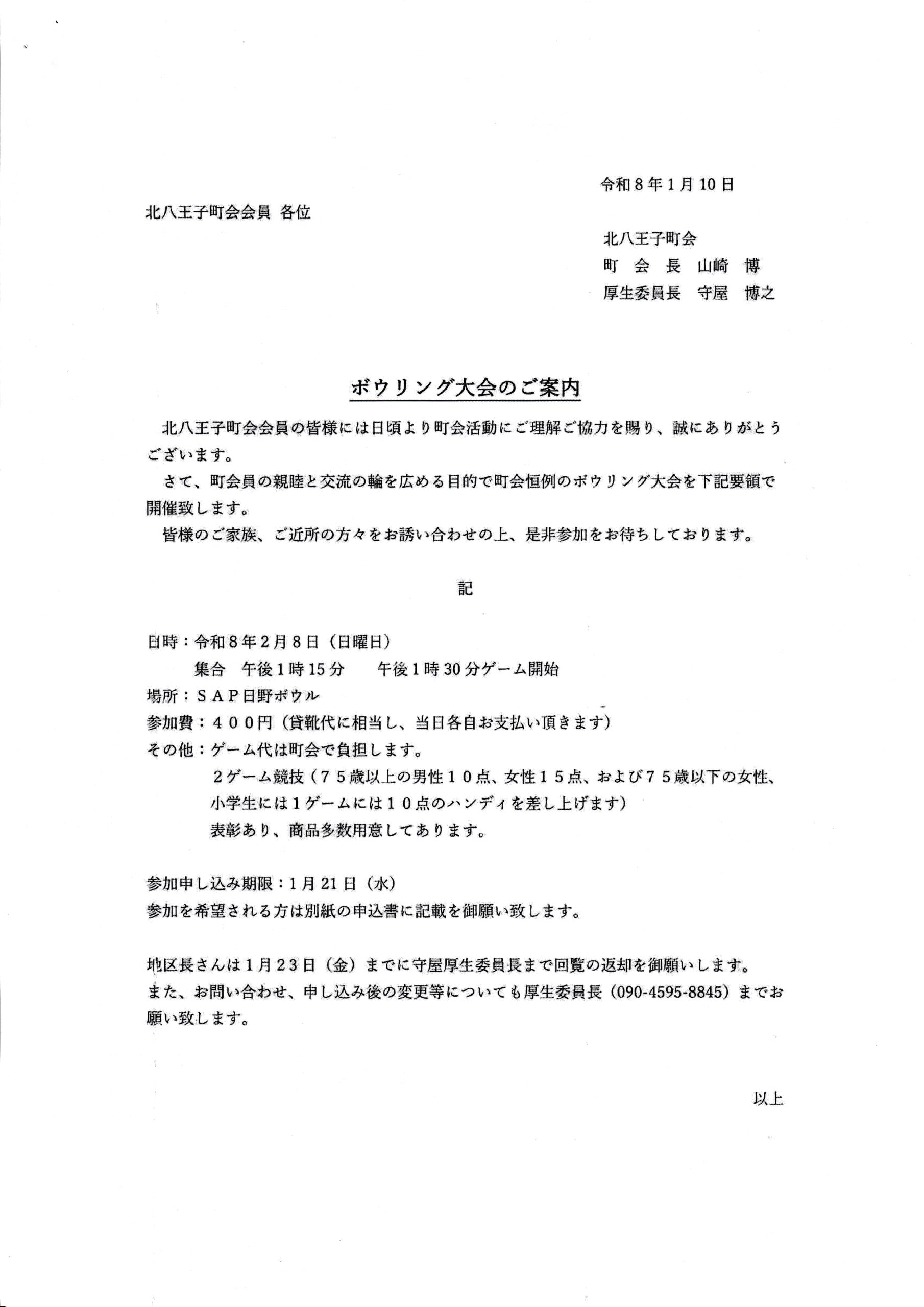 ボウリング大会のお知らせ 2026/1/16 町会恒例のボウリング大会のお知らせです。日時:令和8年2月8日(日) 集合 午後1時15分 1時30分ゲーム開始場所:SAP日野ボウル参加費:400円ゲーム代は町会で負担します。申込期限:1月21日(水)担当厚生委員長 守屋(090-4595-8845)回覧はこちら。
