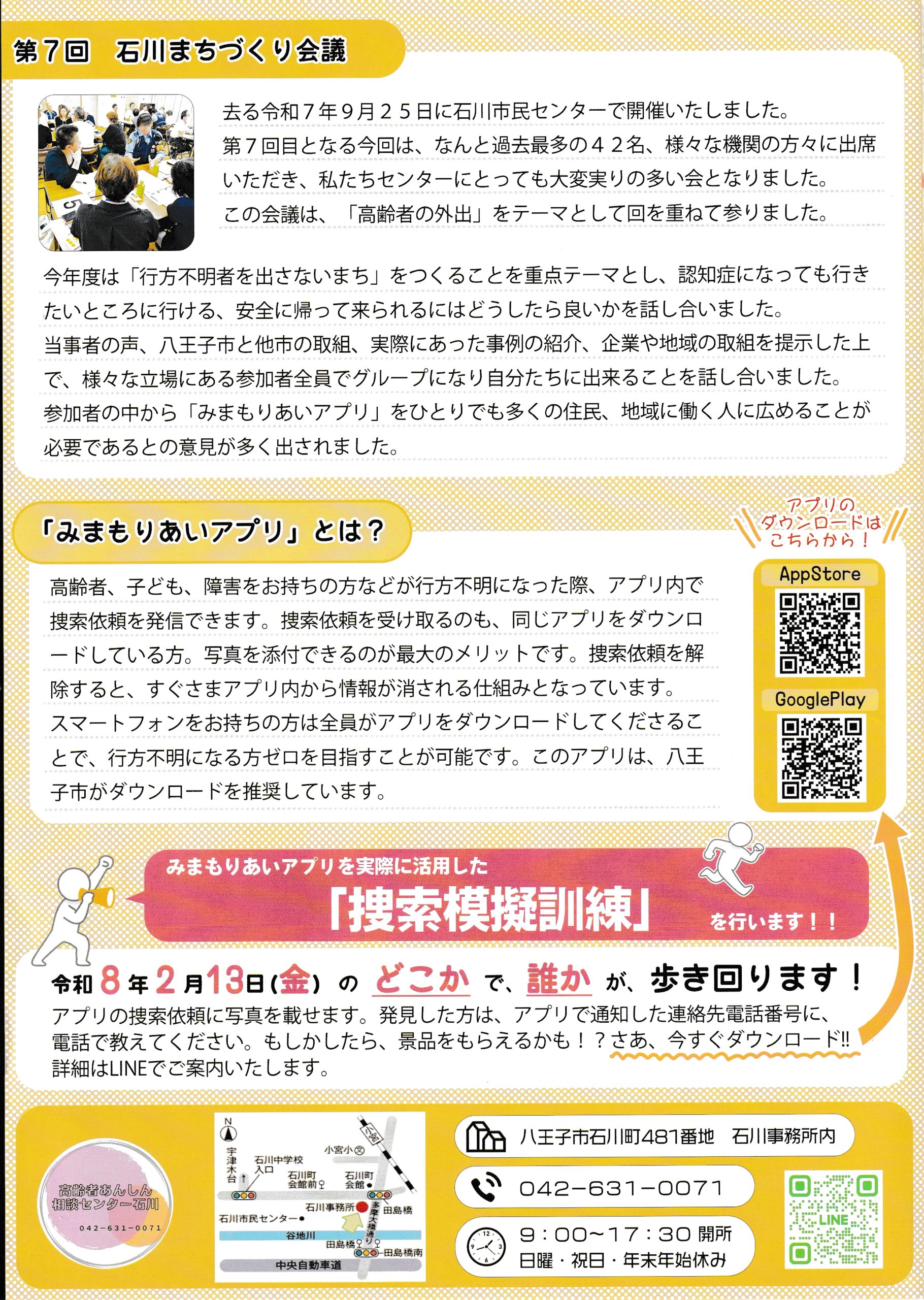 「みまもりあいアプリ」をご利用ください 2026/2/3 高齢者あんしん相談センター石川からのお願いです。「みまもりあいアプリ」のダウンロードを八王子市が推奨しています。高齢者、子ども、障害をお持ちの方などが行方不明になった際、アプリ内で捜索依頼を発信できます。捜索に協力することができます。「捜索模擬訓練」を2月13日㈮に行います。どうぞご参加ください。通信「とこてく」1月号 P1 P2 P3 P4(ダウンロードQRコードはこちら)