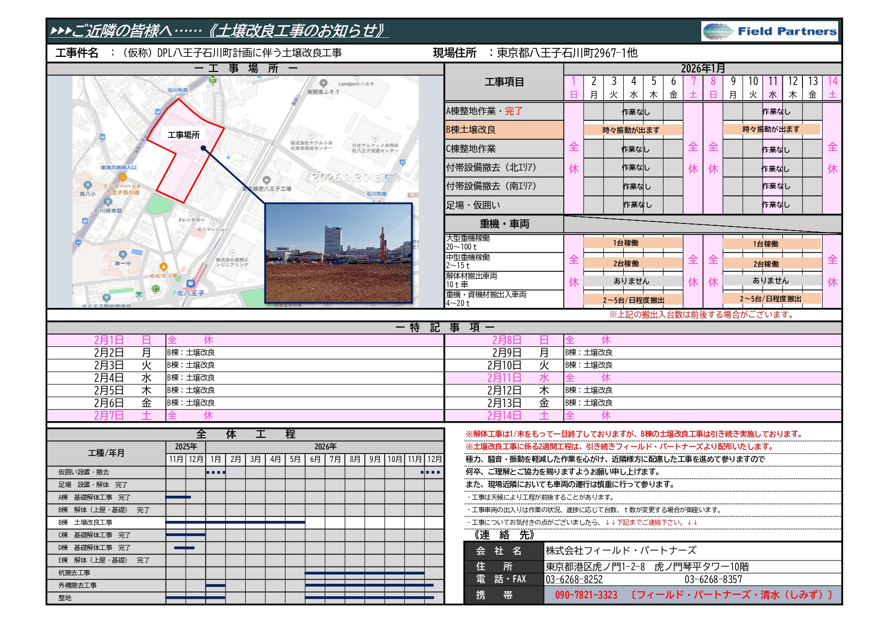 2026/02/1~2026/02/14の詳しい工事日程・内容について、(株)フィールドパートナーズよりお知らせです。