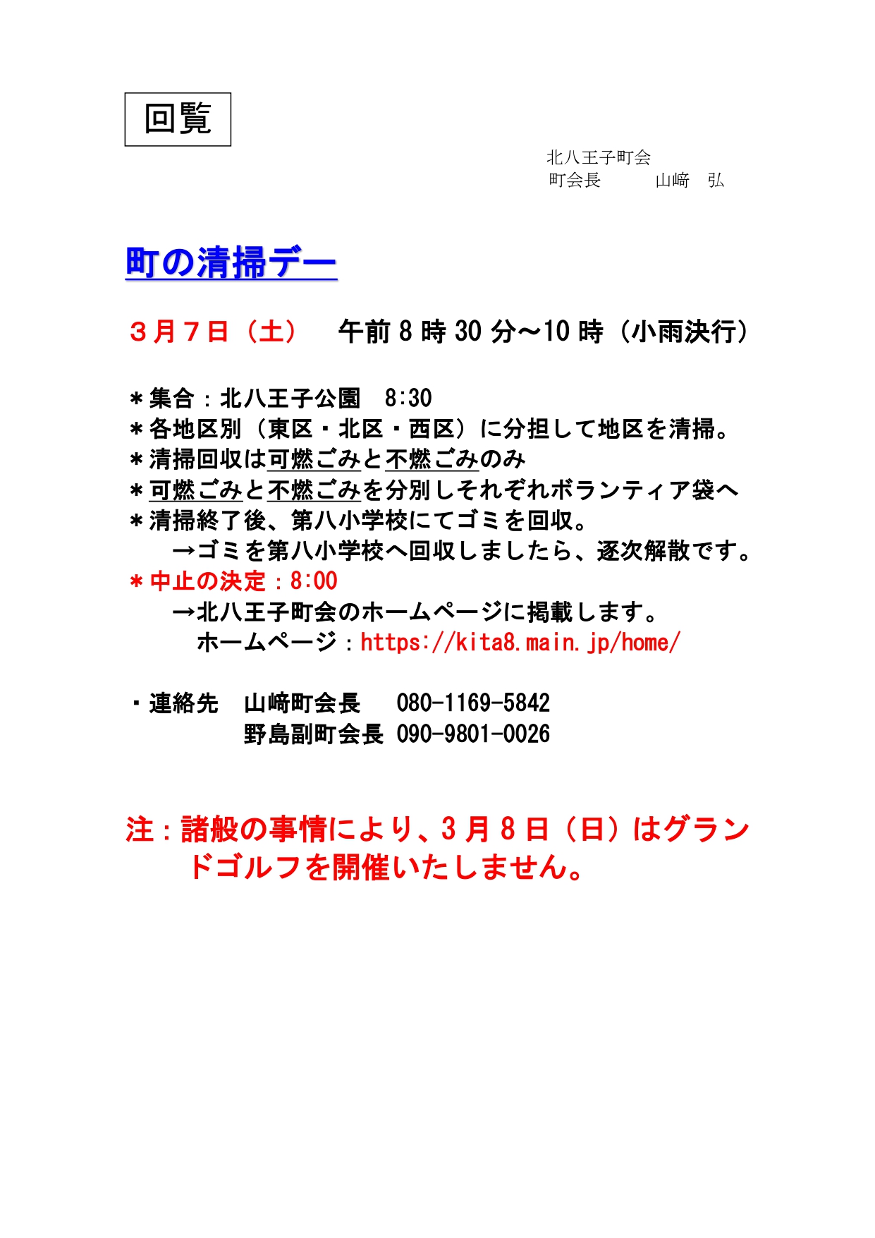 3月7日㈯クリーン活動にご参加ください 2026/2/5 3月7日(土)8時30分~10時(小雨決行)集合は北八公園です。中止の場合は8時にホームページでお知らせします。なお、諸般の事情により、3月8日(日)はグランドゴルフを開催いたしません。回覧はこちら