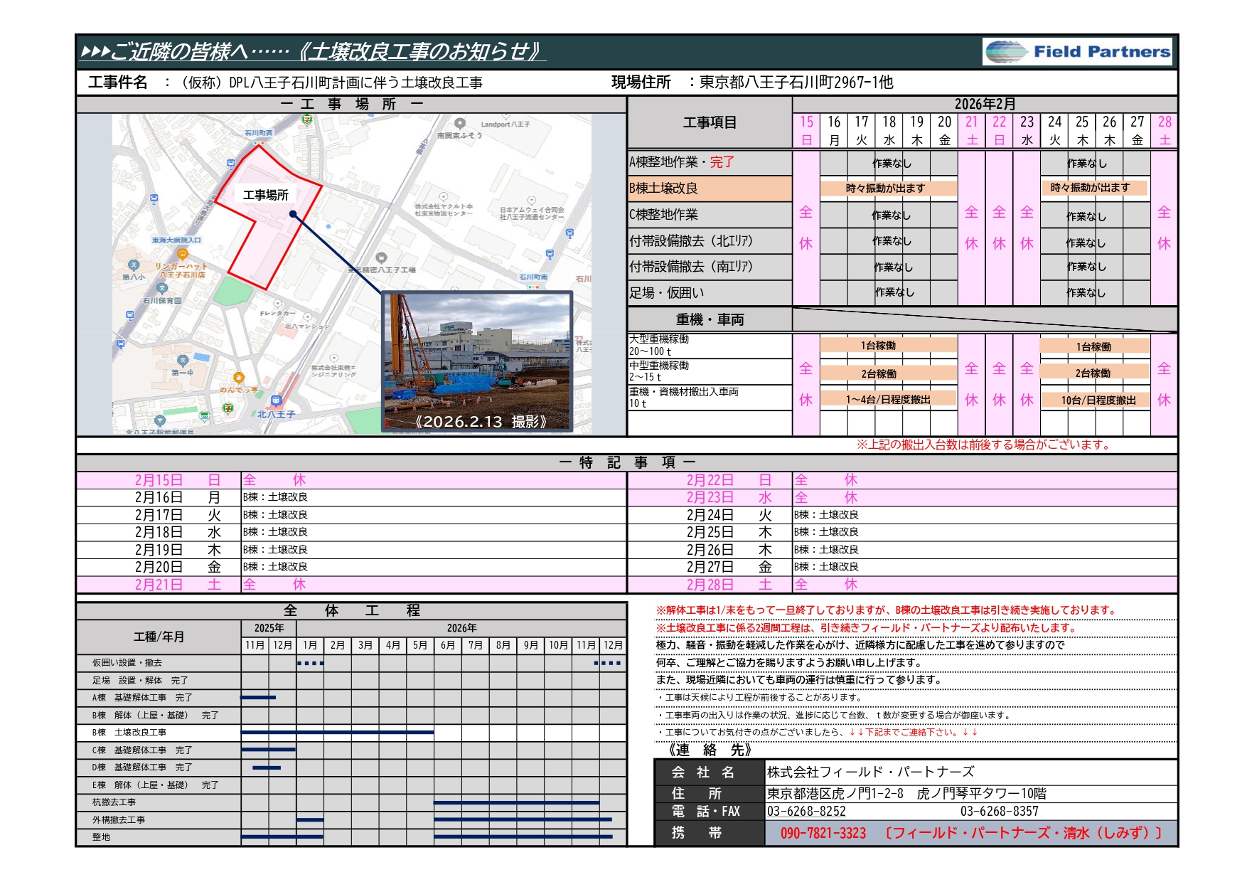 ケンウッド跡地の工事について(5) 2026/2/14 2026/02/15~2026/02/28の詳しい工事日程・内容について、(株)フィールドパートナーズよりお知らせです。2026/02/15~2026/02/28 P1 P2