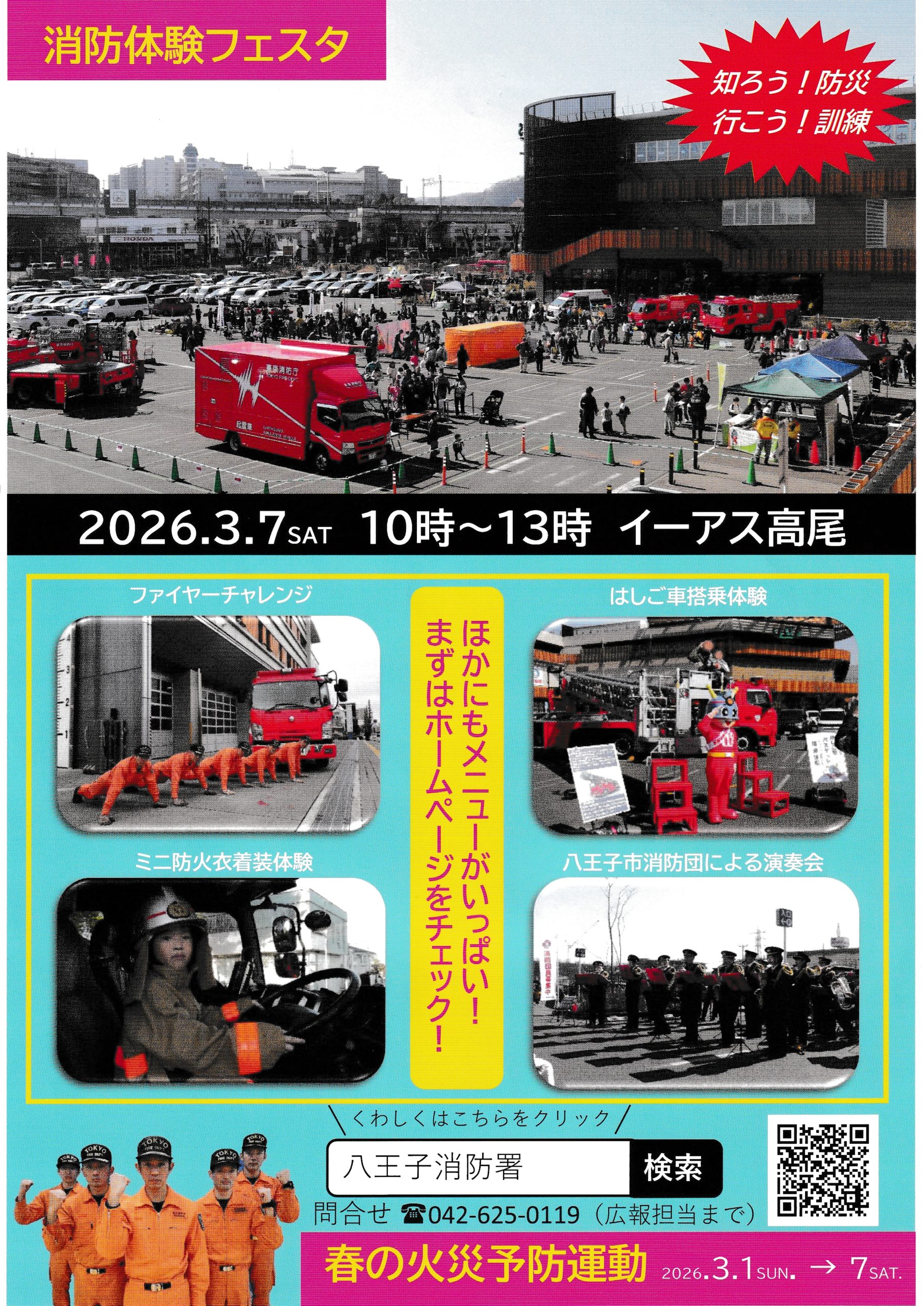 春の火災予防運動と消防体験フェスタ 2026/2/17 3月1日~3月7日は「春の火災予防運動」週間です。消化器がどこにあるか、知っていますか?使い方を知っていますか?消防体験フェスタが3月7日(土)に開催されます。イーアス高尾にて10時~13時。 チラシはこちら 1 2