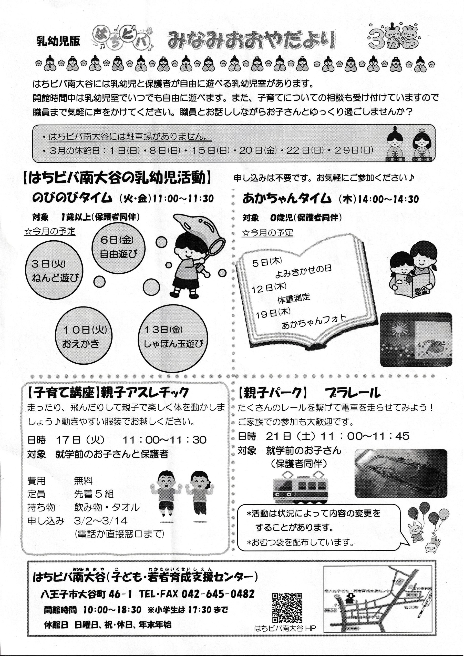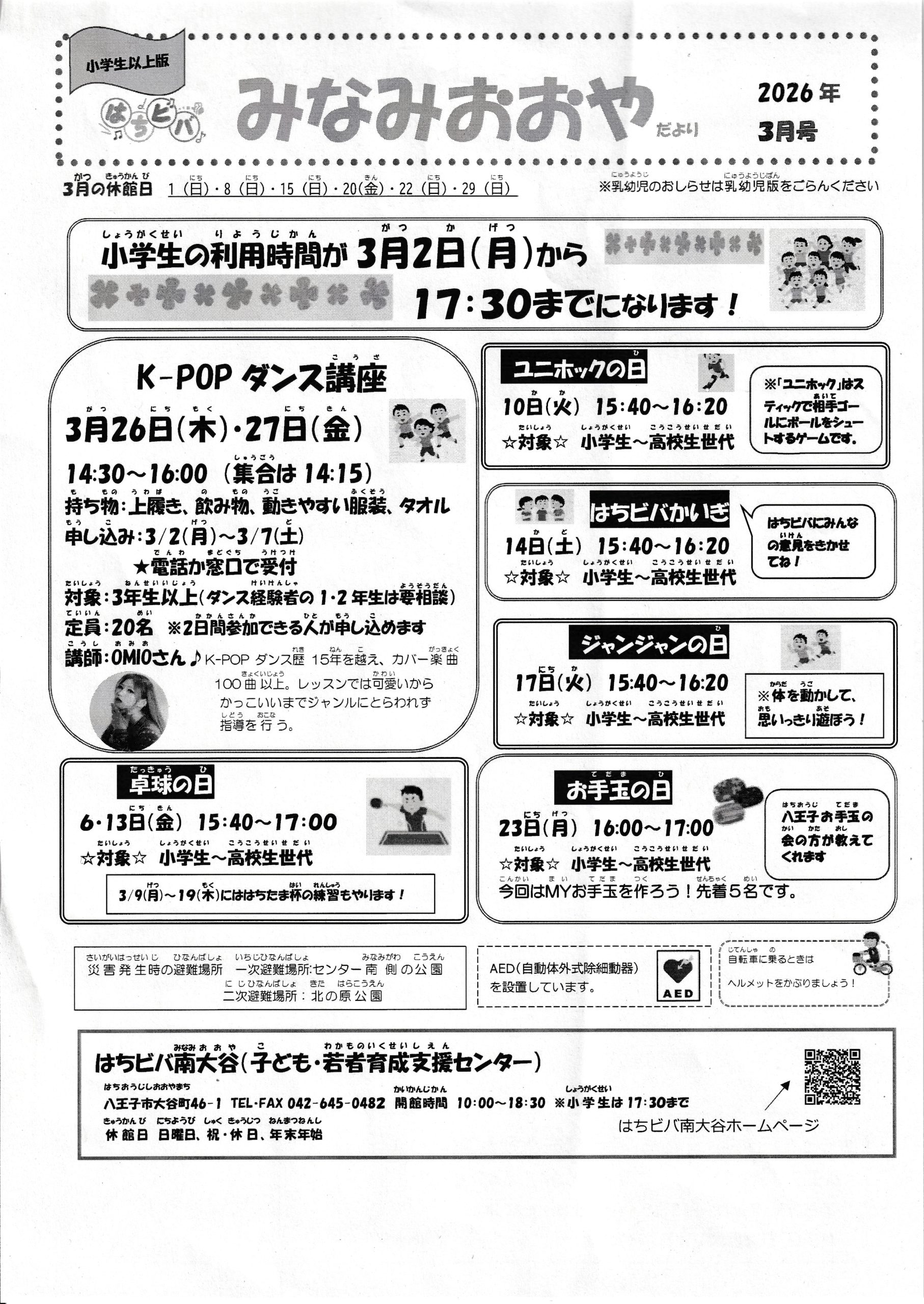 はちビバみなみおおやだより3月号 2026/3/4 はちビバ南大谷で遊ぼう!小学生の利用時間が3月2日から17:30までになりました!ユニホックの日・ジャンジャンの日・卓球の日はちビバ南大谷の乳幼児活動についてはちビバ南大谷だより 表 裏