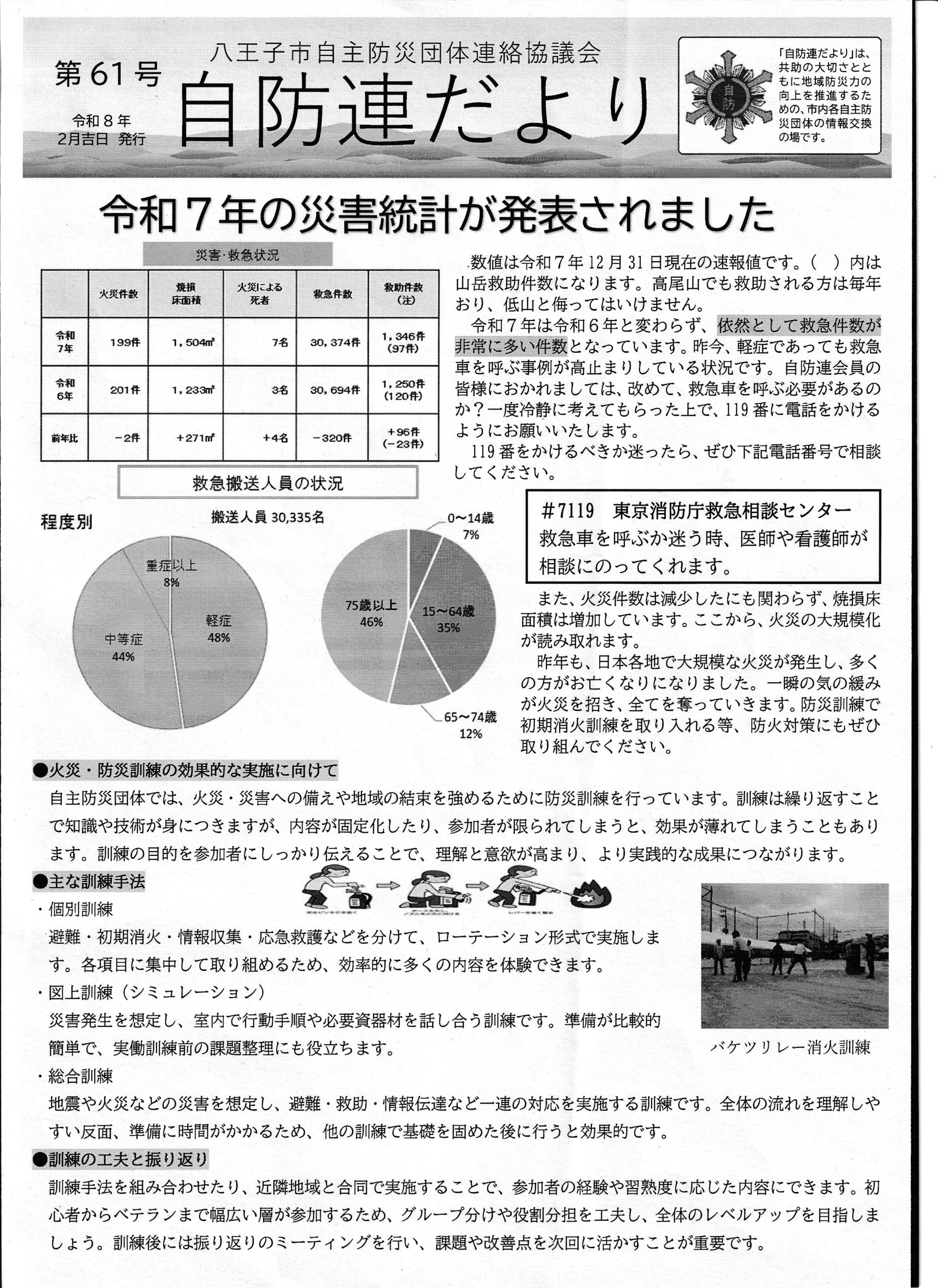 自防連だより 第61号 2026/3/4 令和7年の災害統計が発表されました。八王子市消防団女性隊 全国準優勝の快挙!消防団、頑張ってます!目指せ山火事0件!戦国時代のお城に学ぶ、これからの防災。自防連だより P1 P2 P3 P4