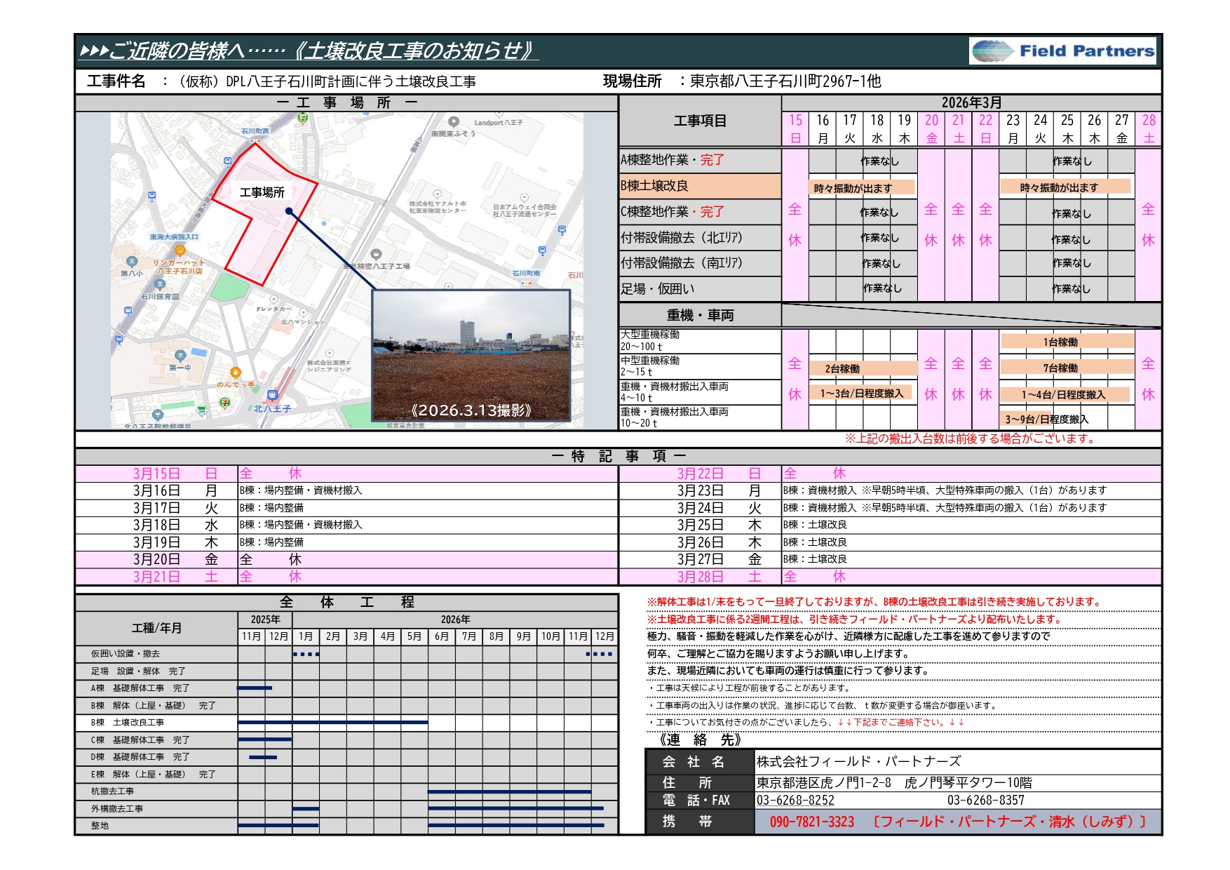 ケンウッド跡地の工事について(7) 2026/3/15 2026/03/15~2026/03/28の詳しい工事日程・内容について、(株)フィールドパートナーズよりお知らせです。2026/03/15~2026/03/28 P1 P2
