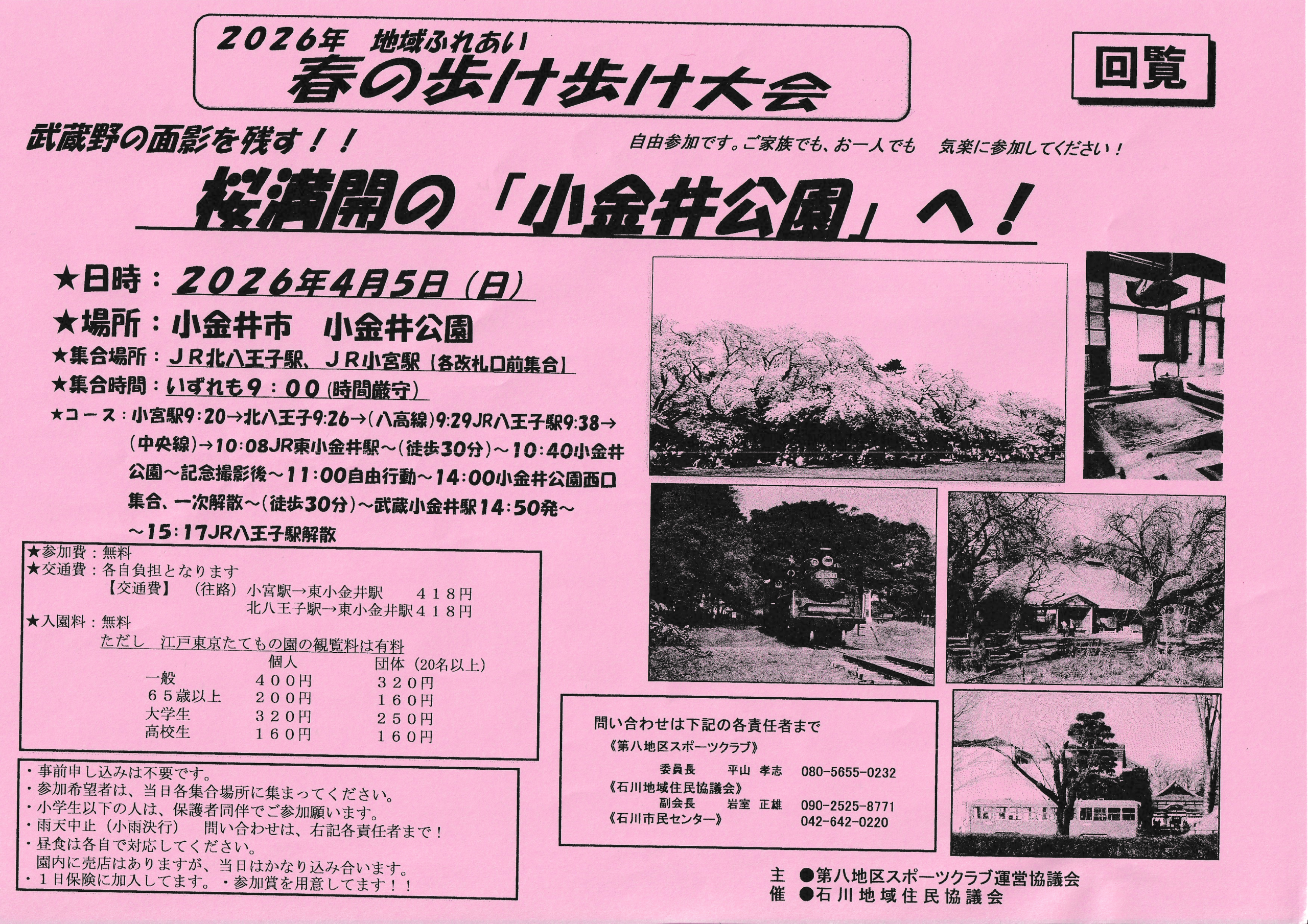「春の歩け歩け大会」のお知らせ 2026/3/15 石川地域住民協議会・第八地区スポーツクラブ運営協議会からのお知らせです。桜満開の「小金井公園」へ!2026年4月5日㈰ 9:00集合 北八王子駅・小宮駅チラシはこちら